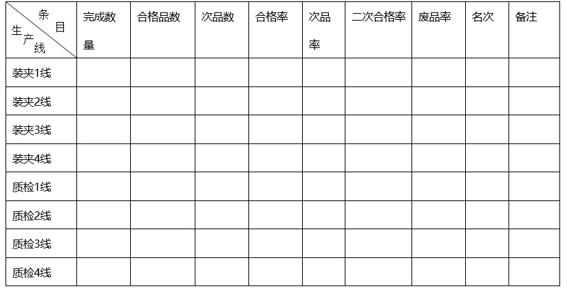 每个流水线加工完成的产品数,全部记录到指定位置,待一天的工作结束后,由专门人员汇总,填写到车间生产任务表上,并做出楼层车间评比。