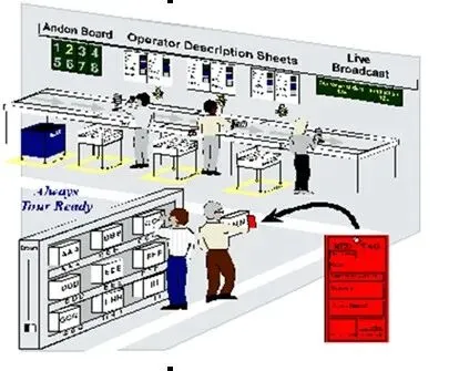 在具体生产线,为维护统一的组织和严格的纪律,提高劳动生产率,实现安全文明生产,凡是与现场工人密切相关的标准、车间纪律、规章制度、注意事项、奖惩措施等都公布于众,时时刻刻提醒员工哪些是鼓励做的,哪些是限制做的,哪些是禁止做的。