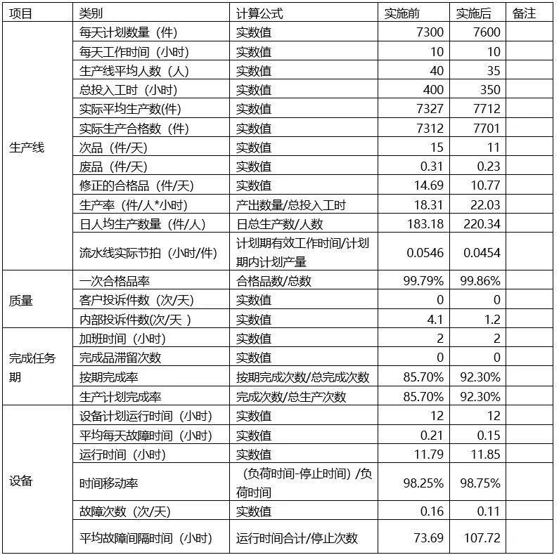 而每天的次品数、废品数、流水线节拍、内部投诉件数、设备平均每天故障时间、设备平均故障次数都有所降低或减少。