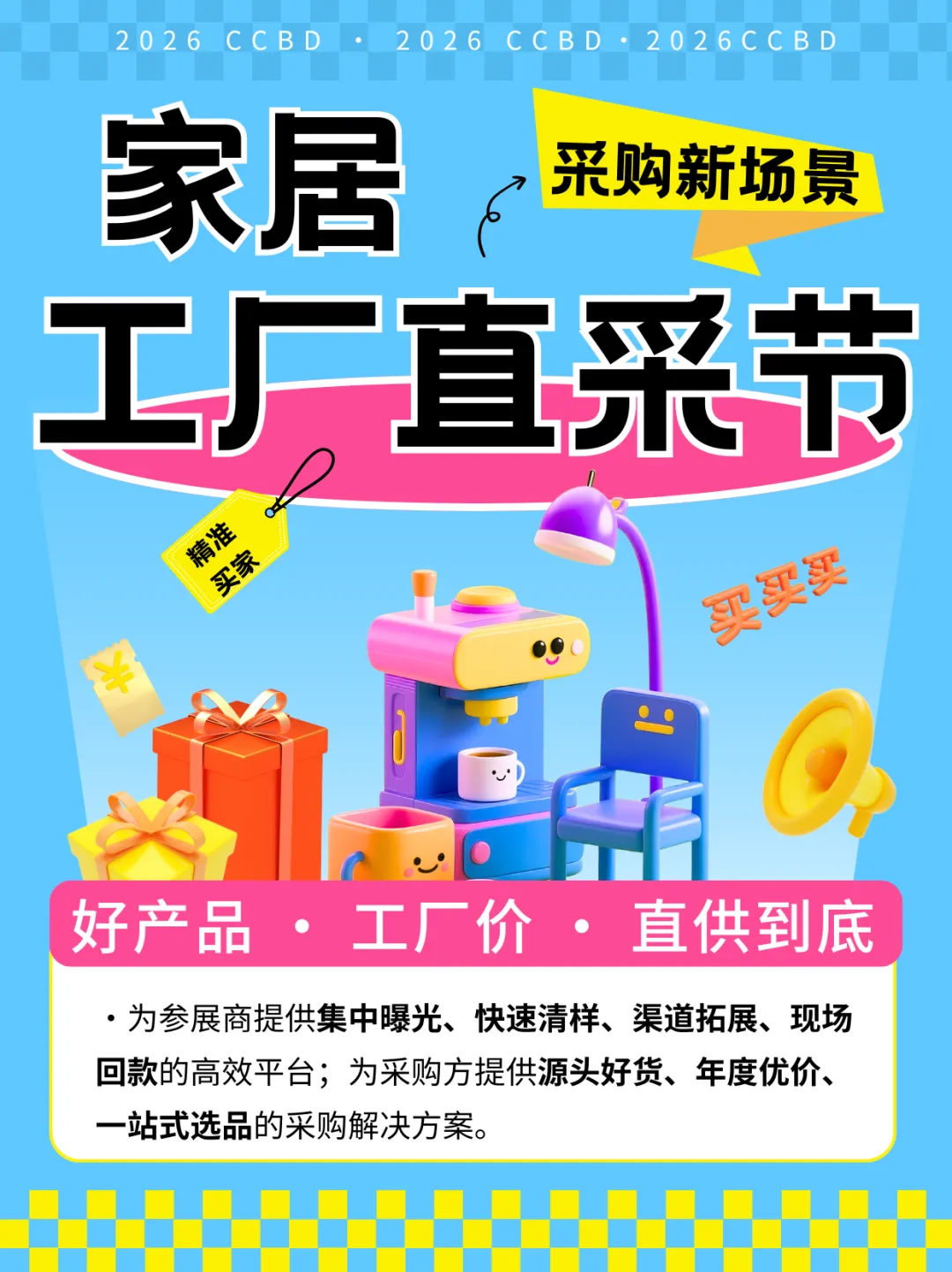 CCBD家居工厂直采节是2026成都建博会打造的B2B采购新场景,旨在打造一个品牌联动的直销平台。我们将汇聚建材家居生产企业与品牌,集中推出高性价比爆款产品,以工厂直供价直接面向设计师、装饰公司与经销商。活动突破传统展会模式,构建“高效率、低成本”的精准采购平台,助力企业集中曝光、快速对接目标客户、拉动现场成交与渠道合作。