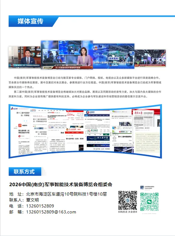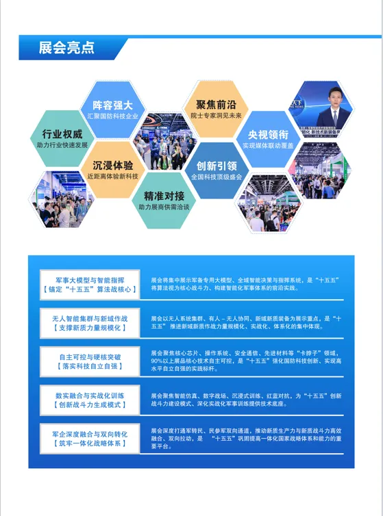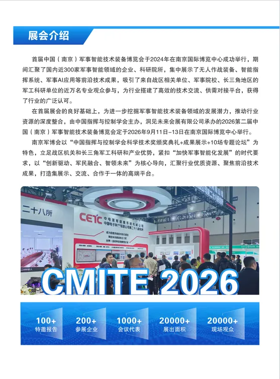 由中国指挥与控制学会主办,北京洞见未来会展有限公司承办的第十一届中国(北京)军事智能技术装备博览会定于2026年5月14日-16日在北京国家会议中心举行。展示内容:指挥信息系统,AI大模型,智能信息技术,电子对抗,仿真训练,航空航天技术,无人装备系统,网络空间安全,新材料新工艺,后勤科技装备等。展览面积将达到50000平方米,届时将邀请政府部门、军委机关、各大战区、各军兵种、军事院校、武警、公安、交通、人防、航天、航空、兵器、船舶、电科集团等从事智能技术研究、生产制造、装备采购和产业投资领域的数万名代表到场参加。