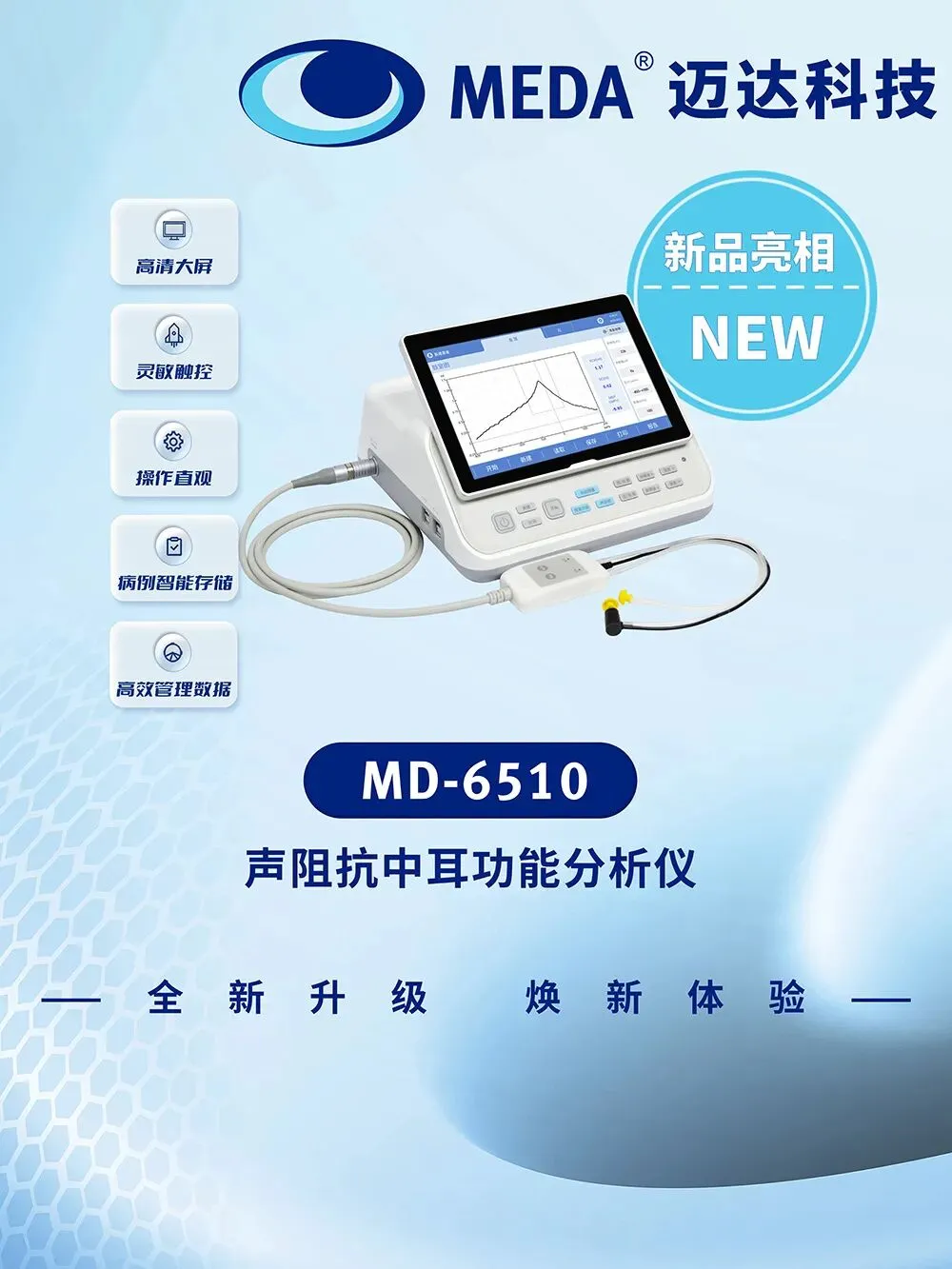 迈达此次还展出MD-6510声阻抗中耳功能分析仪新品,它应用声阻抗测听法,通过测试声能在人耳的传递状态,测量、评价中耳和内耳功能。该新品配备高清液晶触摸屏,操作便捷,可直观显示测量结果,并高效管理测量数据与病例。