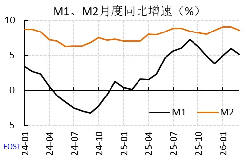值得关注的是,3月末,M1同比增长5.1%,仍处于近年来比较高的水平。M1比M2的流动性更强、在支付交易中使用更为便捷,能够更好反映社会经济活动的活跃程度。2025年下半年以来,M1增速中枢明显回升,带动M2-M1剪刀差连续10个月保持在5个百分点以内,处于近三年来的低位水平,特别是相比2024年9月M2-M1剪刀差10.1个百分点的水平明显改善。