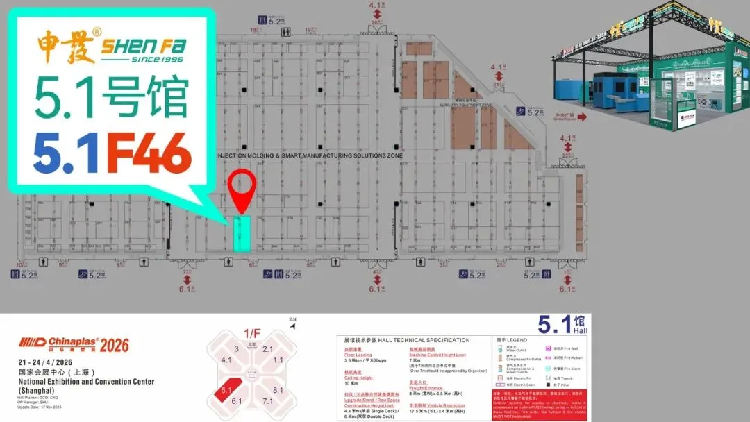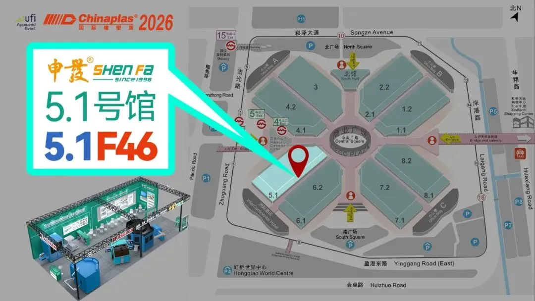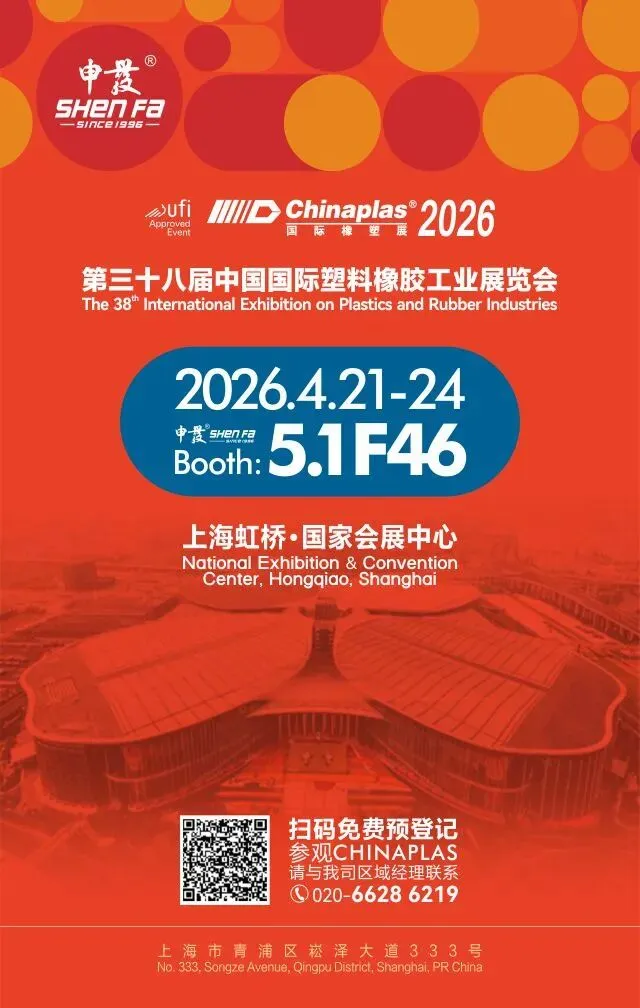 本届CHINAPLAS,申发的展位位于上海·国家会展中心(虹桥)5.1号馆,展位号5.1F46,诚邀新老客户莅临交流。