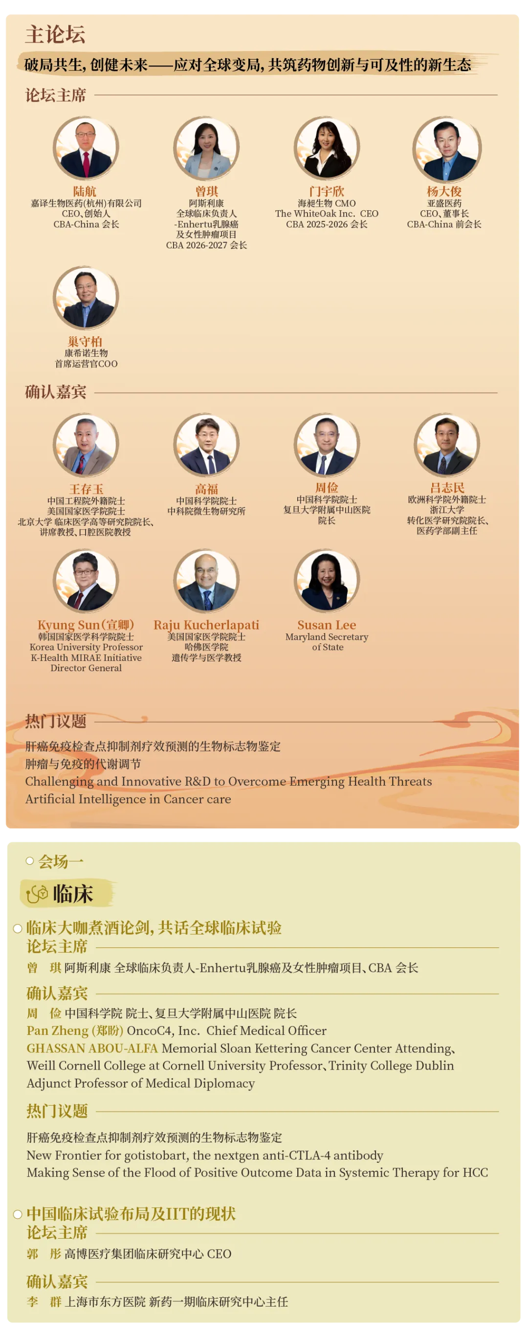 美国华人生物医药科技协会中国分会(CBA-China)始终致力于搭建连接中美、融汇东西的学术与产业桥梁。在此背景下,我们拟定于2026年5月8-10号在无锡举办年度大会,主题确立为“破局共生,创健未来——应对全球变局,共筑药物创新与可及性的新生态”。本届大会旨在汇聚全球顶尖智慧,共同应对当前产业面临的复杂挑战,探索构建一个更加开放、高效且具有韧性的医药创新生态系统。为此,大会精心规划了多个平行论坛,内容全面覆盖从早期研发、临床开发、法规注册到产业化、资本运作的全产业链核心环节。