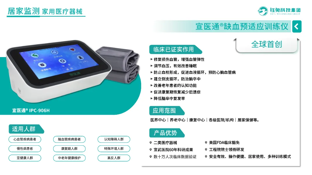 持续临床验证证实:宣医通缺血预适应训练仪在卒中预防、血压调节、改善睡眠、脑小血管病防治等方面疗效明确,是心脑血管疾病防治领域的原创性、突破性创新技术。