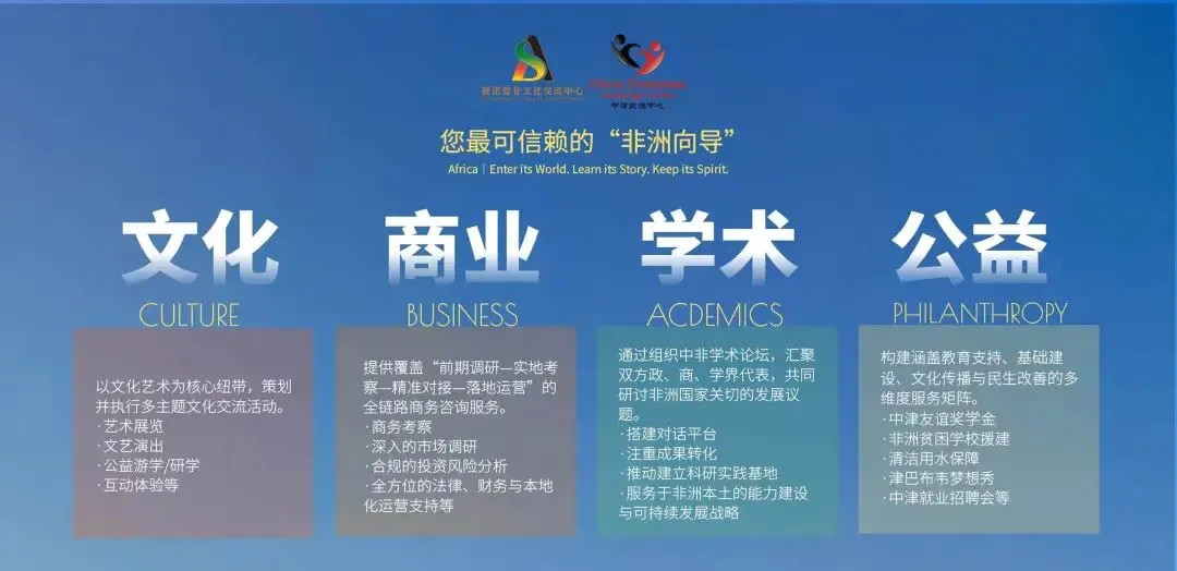 中心聚焦中非文旅推广、商务会展、双向交流、青少年互动等领域,致力于打造集活动策划、商务合作、国际出访、公益项目、品牌传播于一体的综合服务平台。