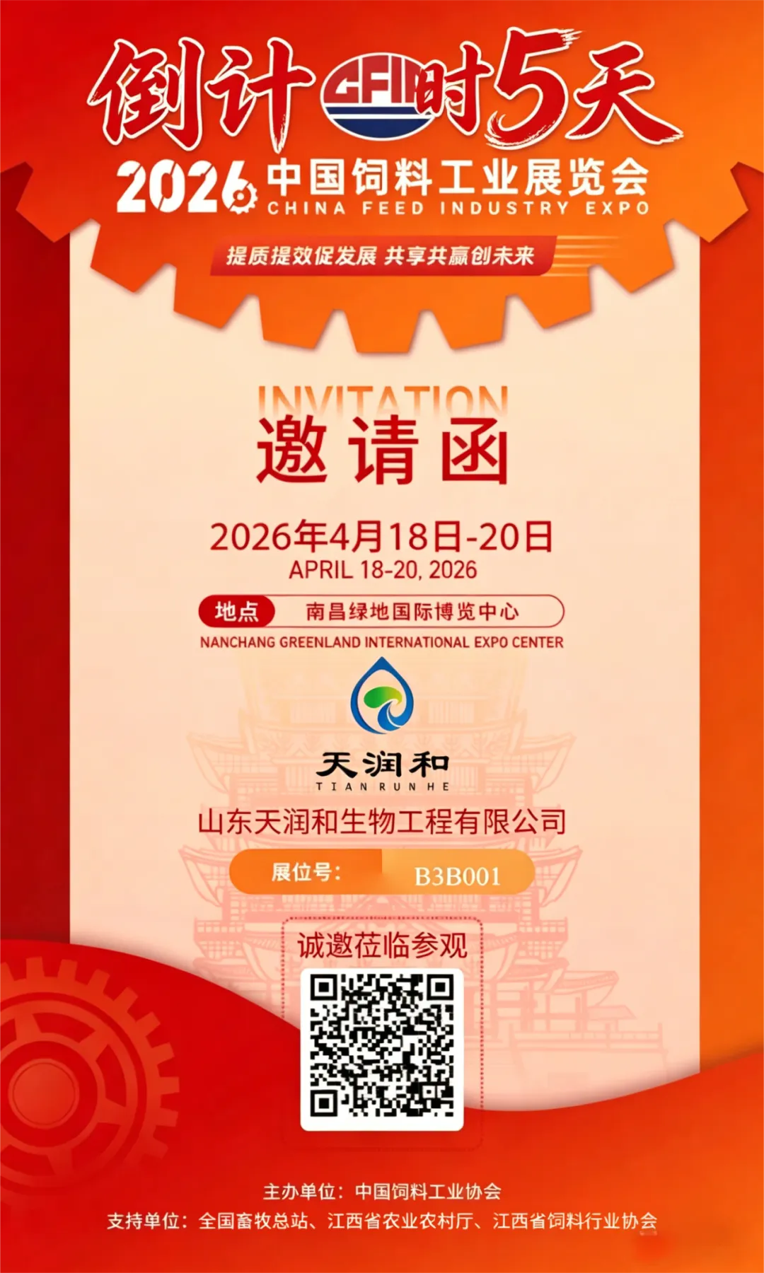 2026 年 4 月 18 日 - 20 日,中国饲料工业展览会将在南昌绿地国际博览中心盛大启幕。本次展会以 “提质提效促发展 共享共赢创未来” 为主题,汇聚行业前沿资源。山东天润和生物工程有限公司盛装亮相,展位号B3B001,诚邀全国行业同仁、合作伙伴莅临参观,共探行业高质量发展新机遇!