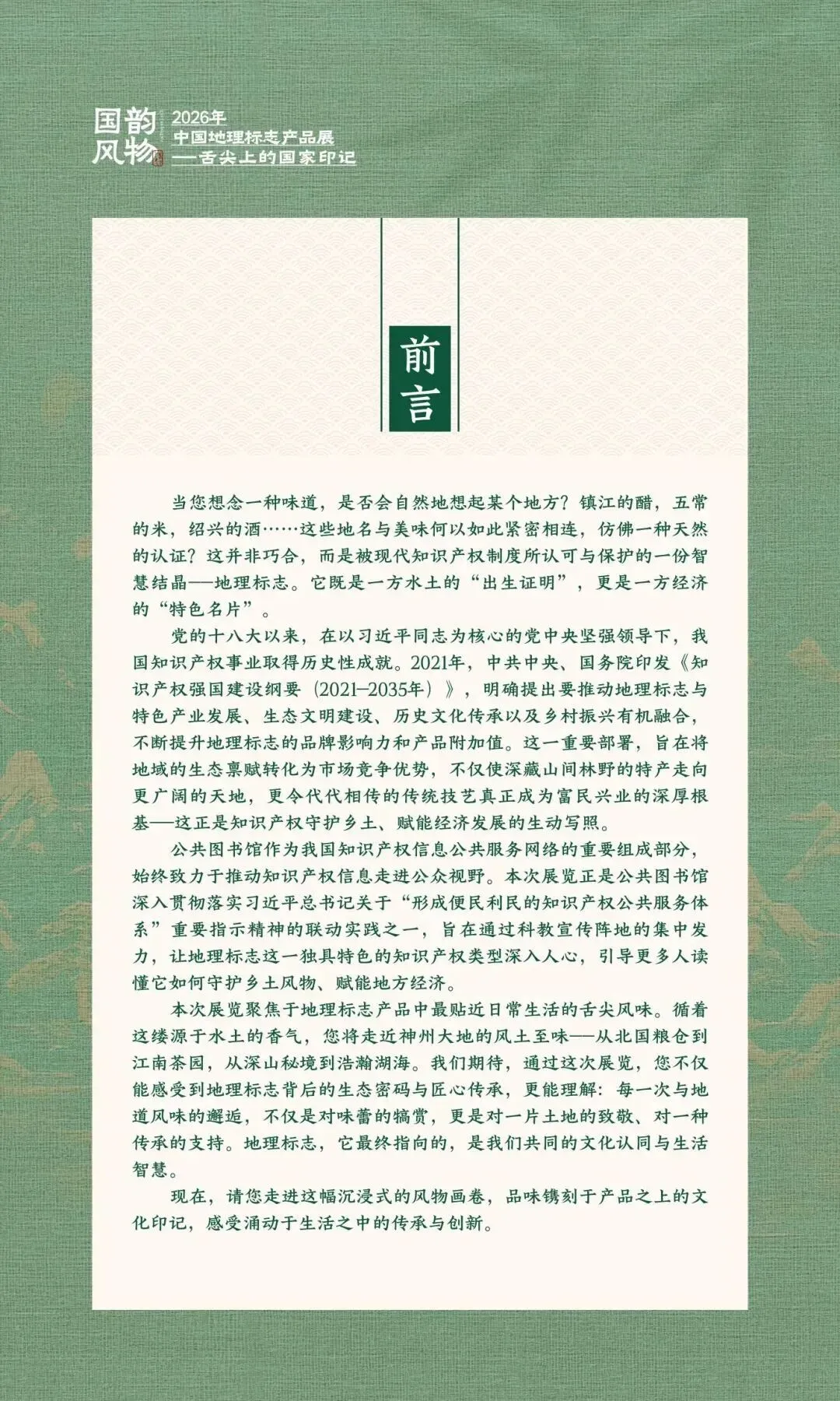 一方水土养一方风物,一味珍馐藏一脉文化。为传承中华优秀传统文化,展现祖国大地的丰饶物产,我馆特别推出“国韵风物·2026年中国地理标志产品展——舌尖上的国家印记”线上展览。