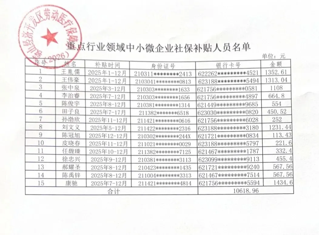 按照《关于预拨2025年中央财政稳就业扩大社会保险补贴范围补助资金的通知》(鞍财指社[2026]243号)文件要求,经审核,现将拟发放重点行业领域中小微企业社保补贴进行公示。