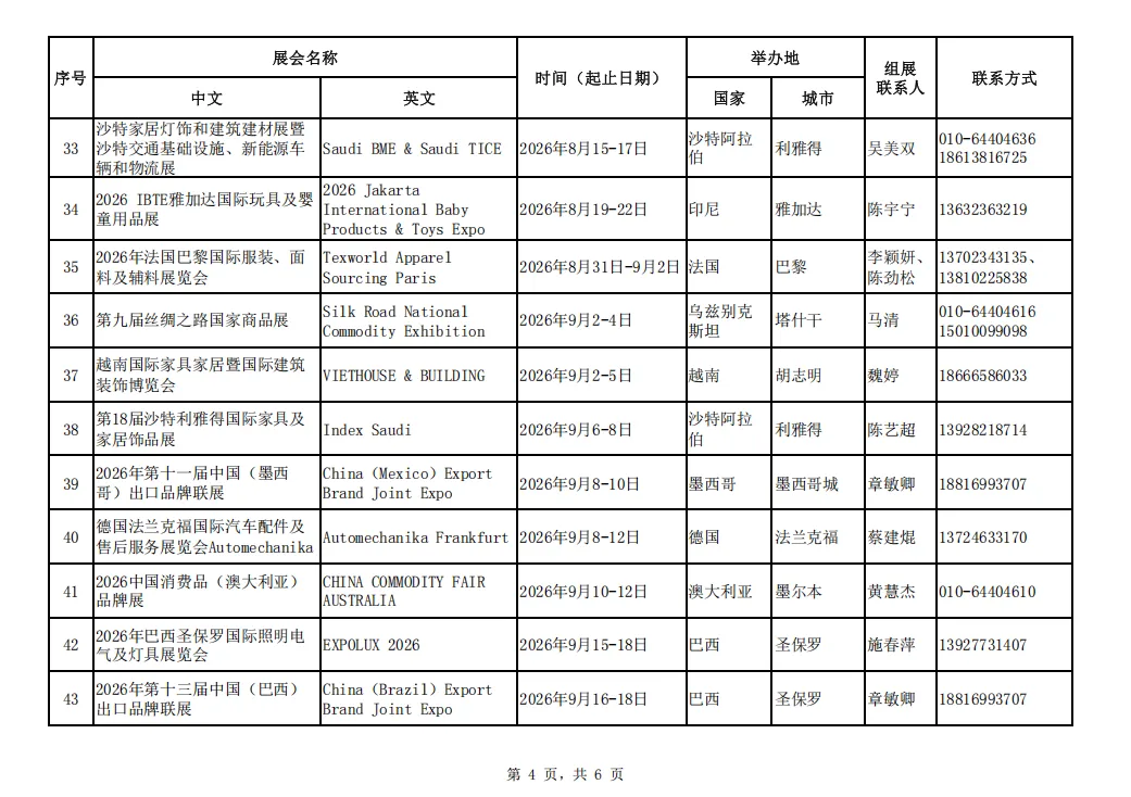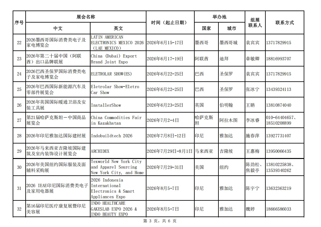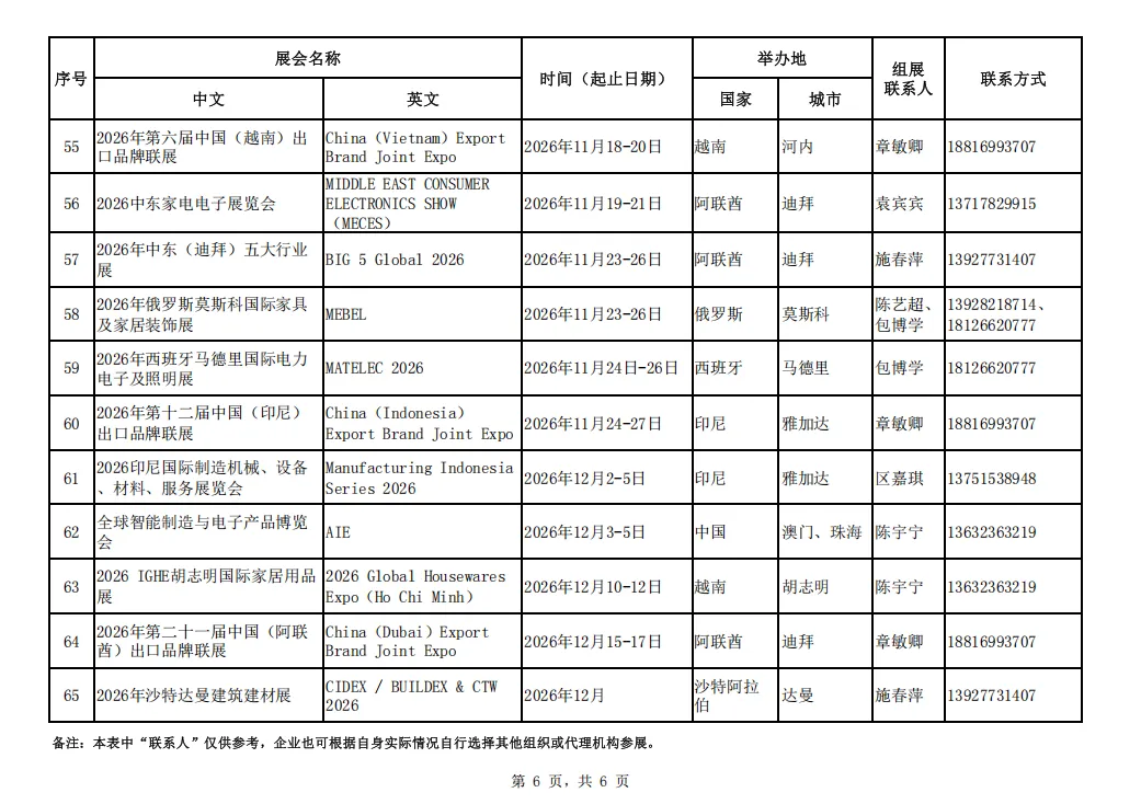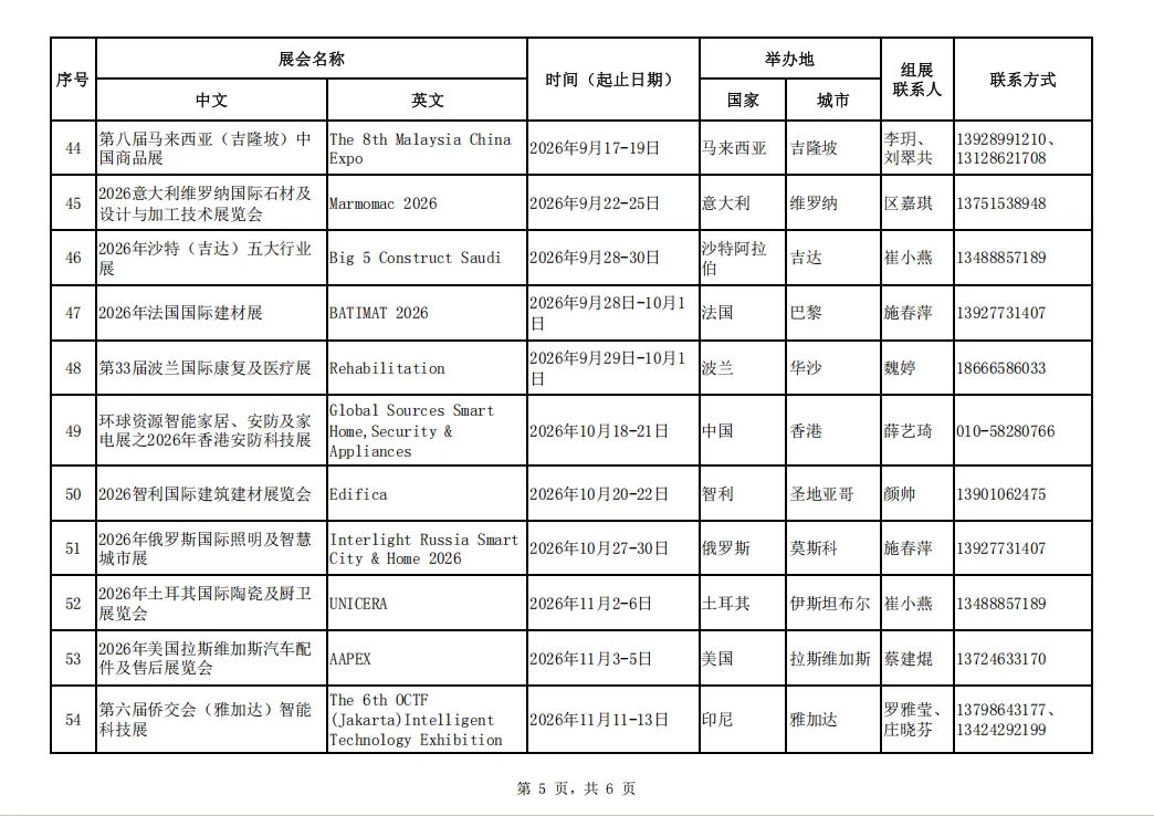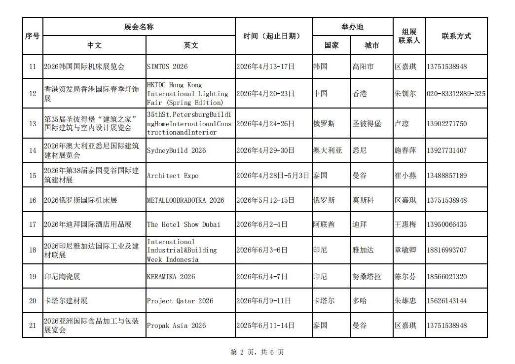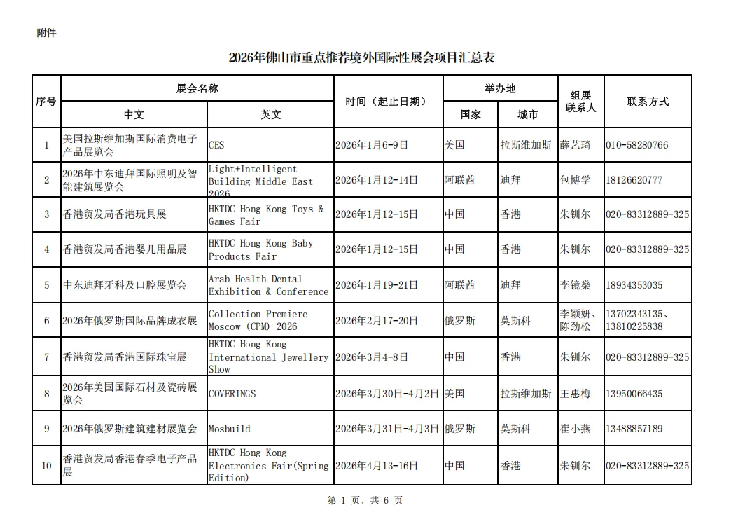 为贯彻落实中央、省、市各级稳外贸工作部署,促进佛山企业通过多渠道开拓海外市场,抢抓国际订单,经比选,我局确定了65场境外线下重点展会作为2026年佛山市重点推荐境外国际性展会项目(名单见附件)作为我市2026年佛山市重点推荐境外国际性展会项目。