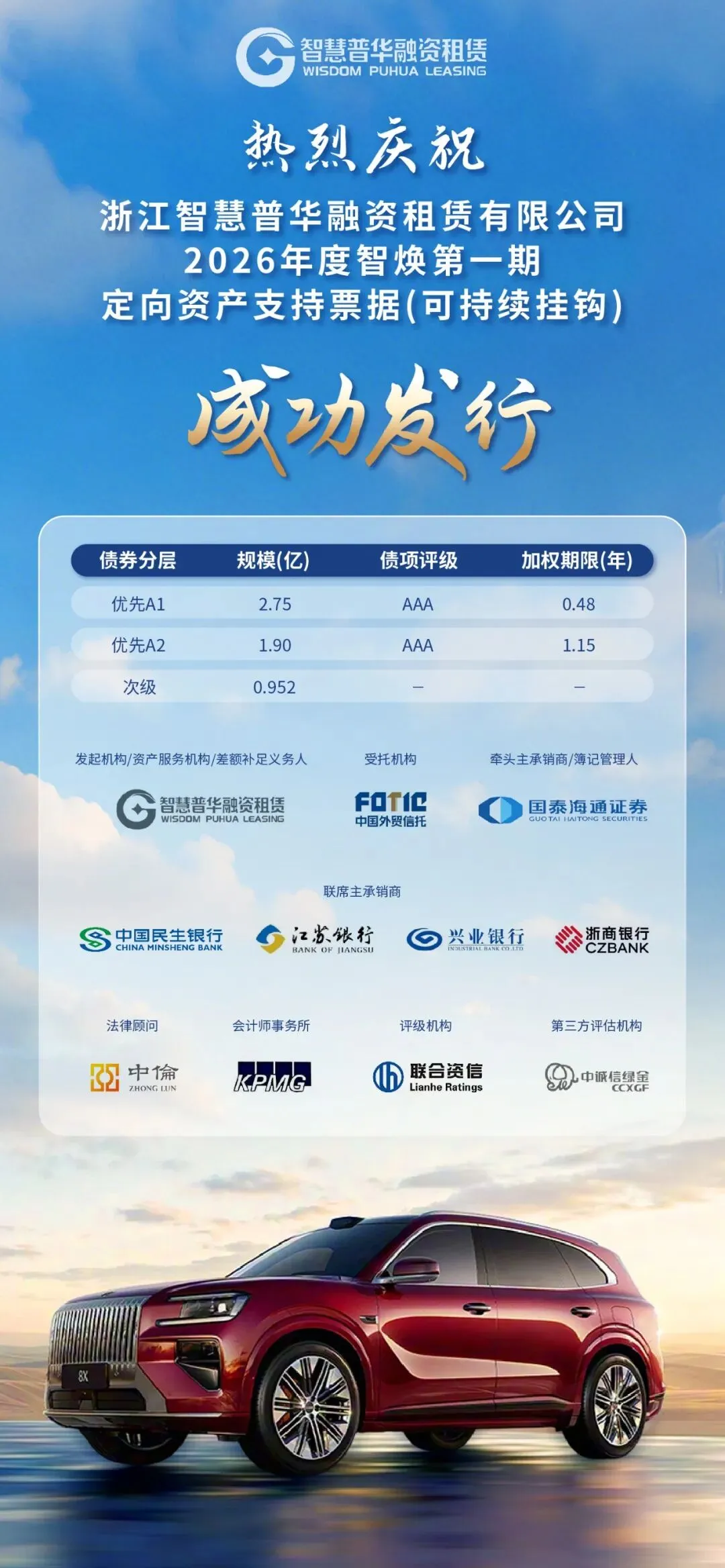 2026年4月9日,由浙江智慧普华融资租赁有限公司(以下简称“智慧租赁”)作为原始权益人发起的“2026年度智焕第一期资产支持票据(可持续挂钩)”成功发行。该项目为浙江省首单“可持续挂钩资产支持票据”,总规模达人民币5.602亿元。