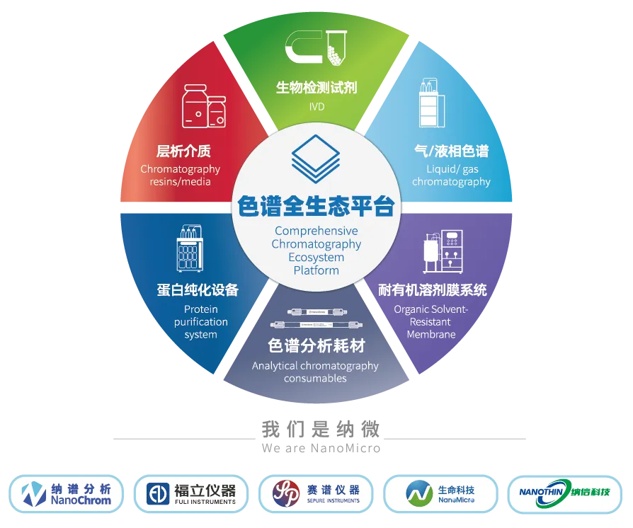 凭借持续的创新驱动,纳微科技致力于打造全球领先的纳米微球精准制备和应用平台,产品涵盖硅胶正相、反相、HILIC、手性填料、固相萃取、聚合物反相、离子交换、疏水层析、亲和层析(Protein A、金属螯合、苯硼酸)、复合模式、凝胶渗透色谱及特殊功能填料;整合旗下纳谱分析(色谱柱与应用)、福立仪器(分析仪器)、赛谱仪器(蛋白纯化系统)等子公司关键资源,成功构建了从色谱填料→色谱柱→分离/分析设备→智能化解决方案的全产业链闭环,打造全球领先的“色谱全生态平台”。