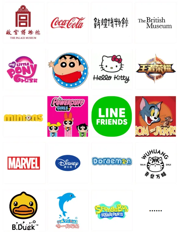 迪士尼、漫威、环球IP、可口可乐、故宫、大英博物馆、小黄鸭、哆啦A梦、宝可梦、小黄人、吾皇猫、小马宝莉、悟空、王者荣耀、海绵宝宝、本潮纲目、MOOMIN、华漫......