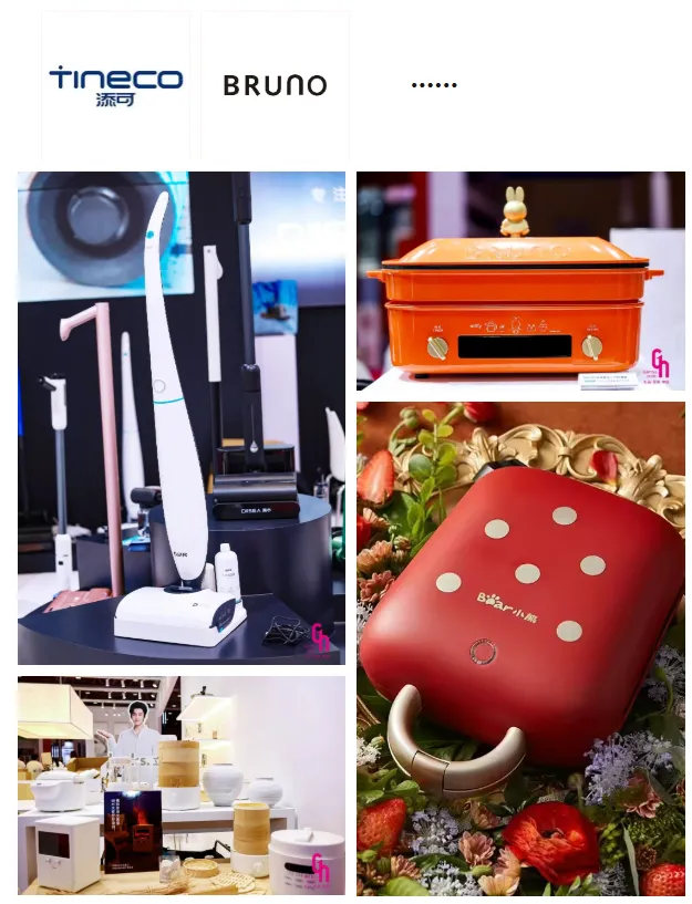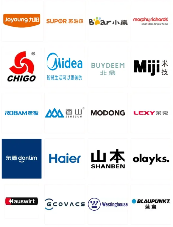 苏泊尔、九阳、小熊、美的、志高、摩飞、北鼎、老板、西屋、艾贝丽、海氏、海尔、米技、科沃斯、添可、香山、莱克、滴水、奥克斯、正负零、公牛、博鲁诺、小白熊、中山梦熊、华强电器、威氪智创、贝立安、山西嘉世达......