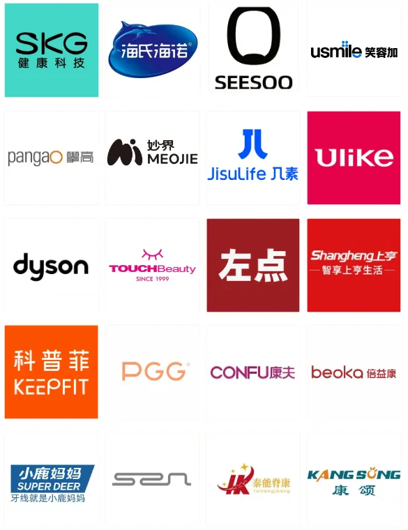 SKG、几素、苏戈恩、海氏海诺、上亨、攀高、戴森、妙界、渲美、PGG、左点、眠虫、777、迷你熊、广东久利、倍益康、宁波劲米、泰能脊康、金华活劲、温州迈景、usmile笑容加、小鹿妈妈、科普非keepfit、派轻松.....