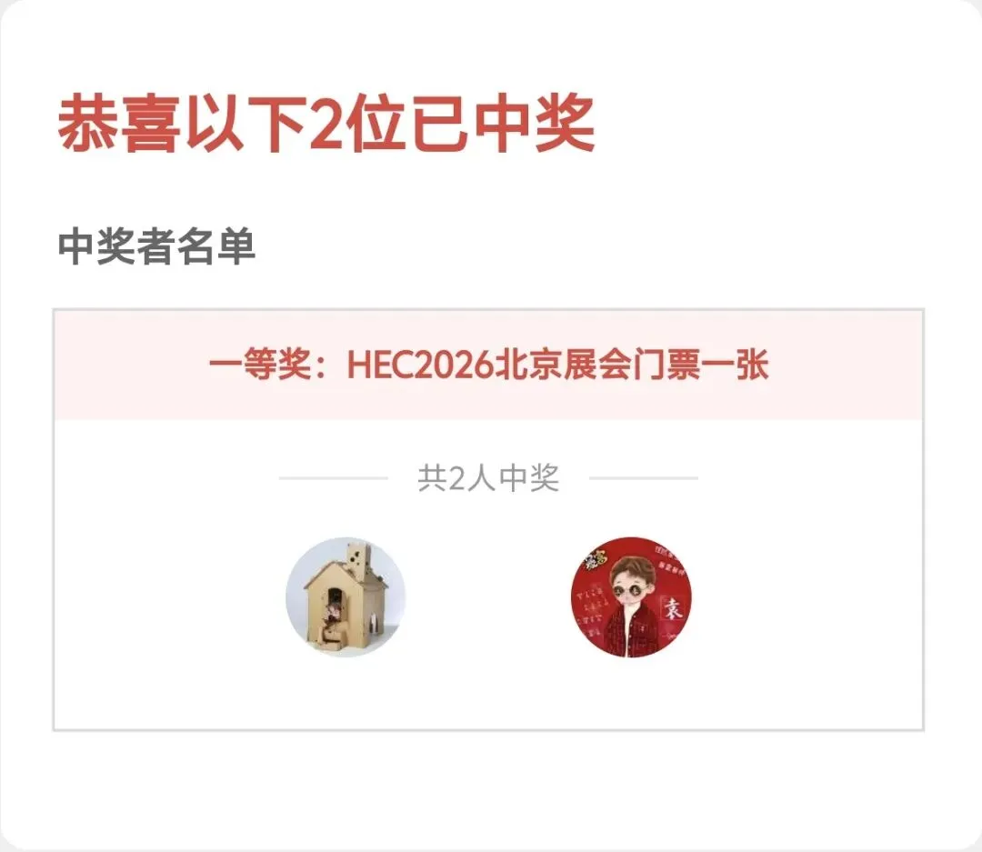 恭喜微信ID名为"涛默涛"和"辰。陌陌"的两位朋友中奖,我们将各送出一张HEC2026北京展会虚拟门票。请获奖的朋友通过后台私信发送您的姓名和手机号码登记领奖。