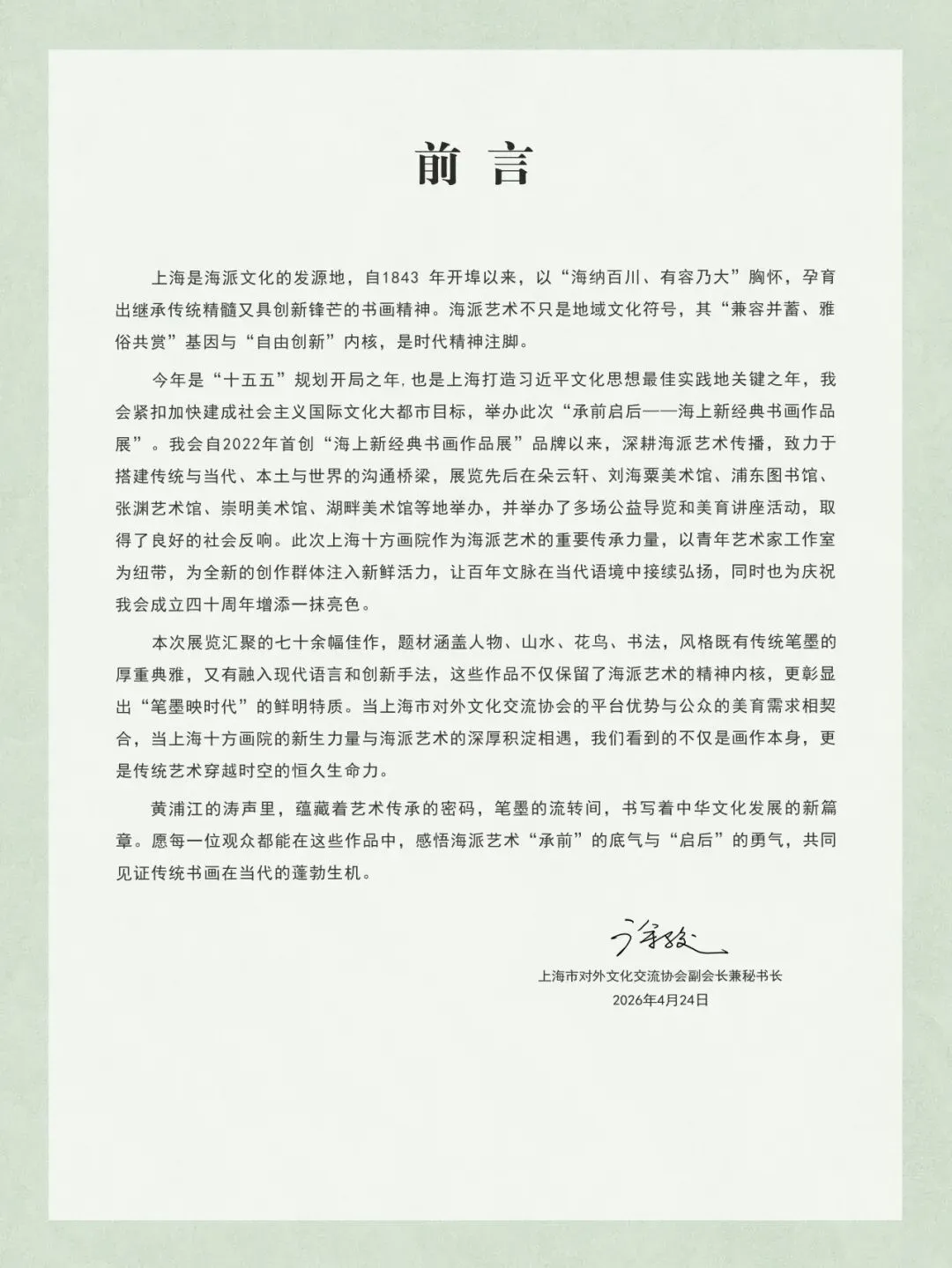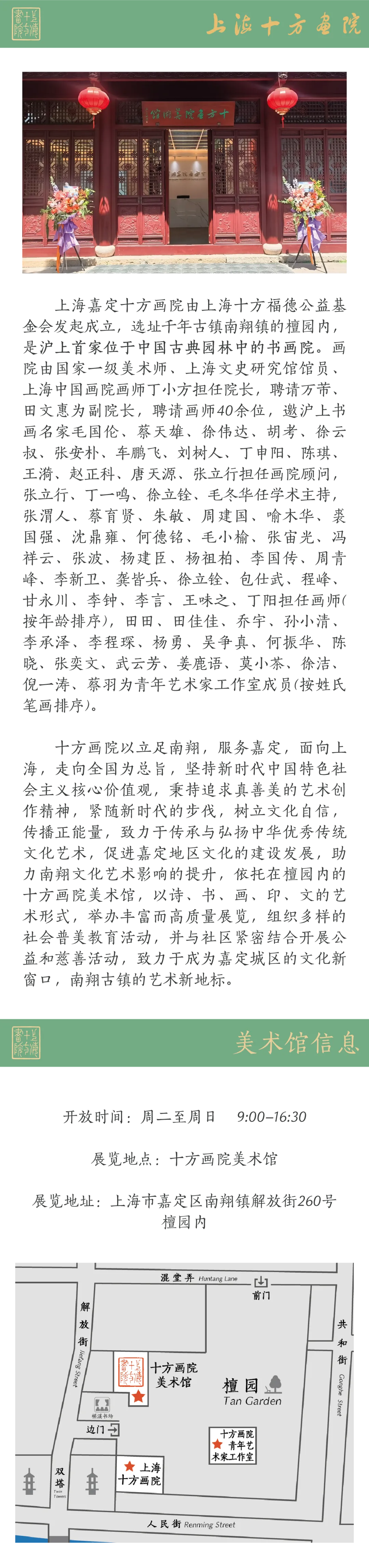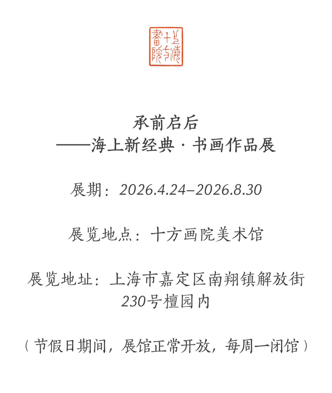 4月24日-8月31日,由上海市对外文化交流协会与上海市嘉定区文化和旅游局、南翔镇人民政府、上海十方福德公益基金会主办,上海嘉定十方画院承办,嘉定区民族和宗教事务办公室支持,嘉定区南翔镇文化体育服务中心、上海南翔老街建设发展有限公司协办的“承前启后——海上新经典书画作品展”在上海十方画院举办。