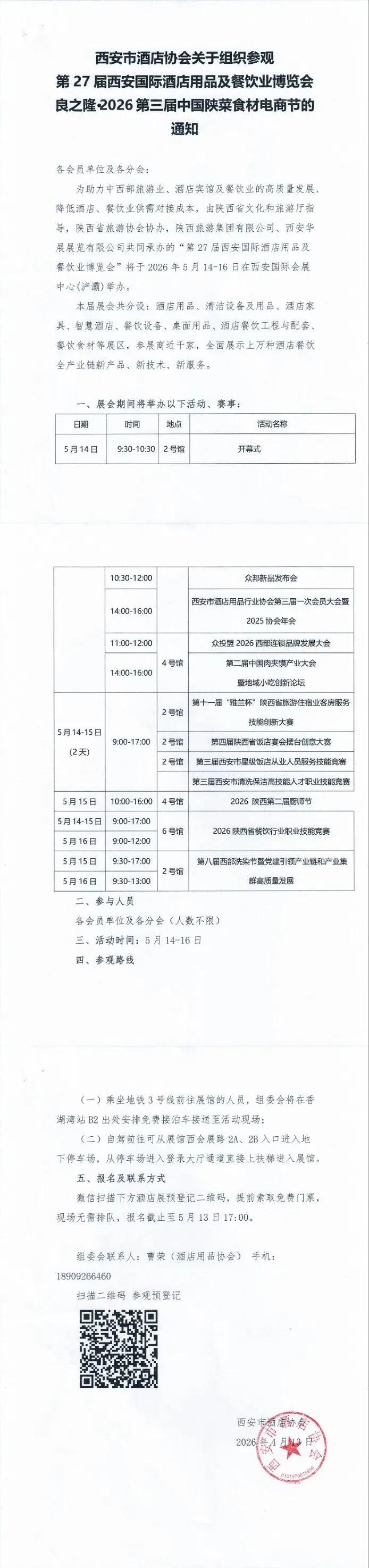 第27届西安国际酒店用品及餐饮业博览会将于2026年5月14至16日在西安国际会展中心(浐灞)举办