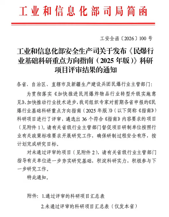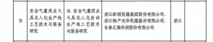 近日,工业和信息化部安全生产司公布《民爆行业基础科研重点方向指南(2025年版)》科研项目评审结果。由新联民爆集团牵头申报的"安全气囊用点火具无人化生产线工艺技术与装备研究"项目成功通过专家评审,正式入选民爆行业基础科研重点项目。