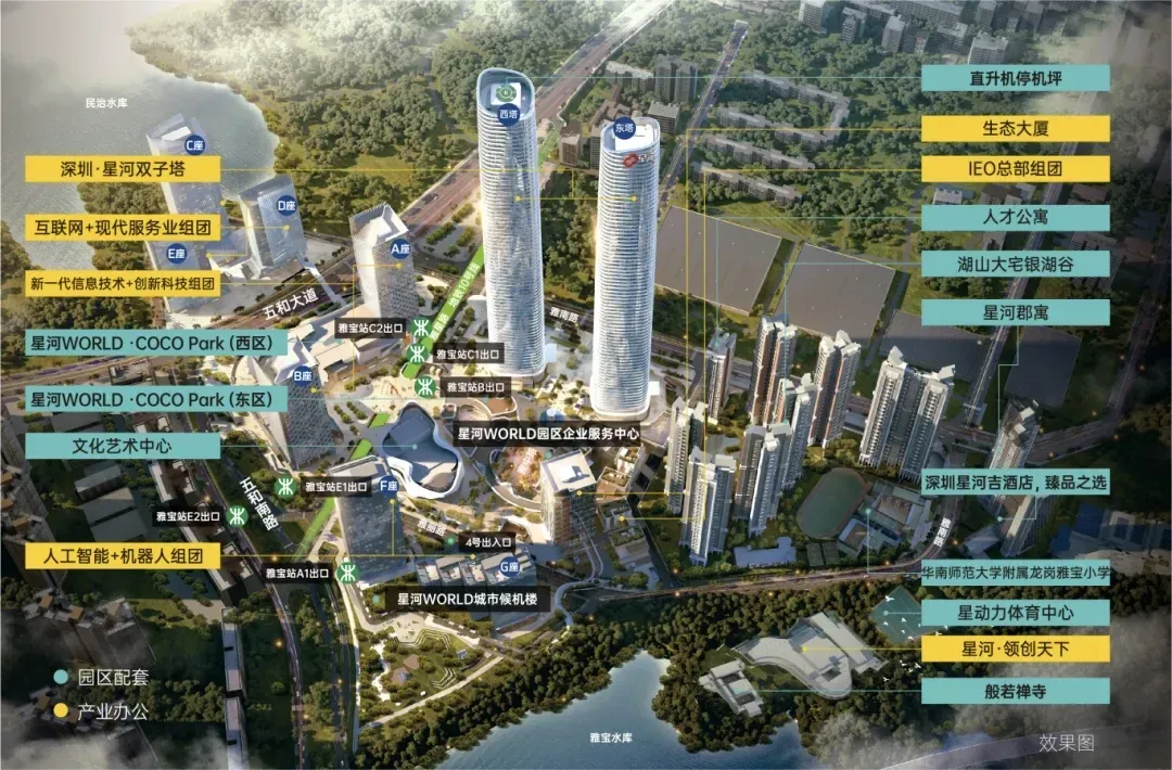 产城园区主体规划:总建筑160万㎡产融新城,369米双子塔(TOP10深圳超高层地标),TOP10优秀园区,生态大厦,IEO总部,星河吉酒店,人才公寓,体育中心,文化中心,特色小镇,跨境电商示范基地,(机器人)署(号称天下第一署),机器人街区,机器人剧场,机器人馆\厅\店。