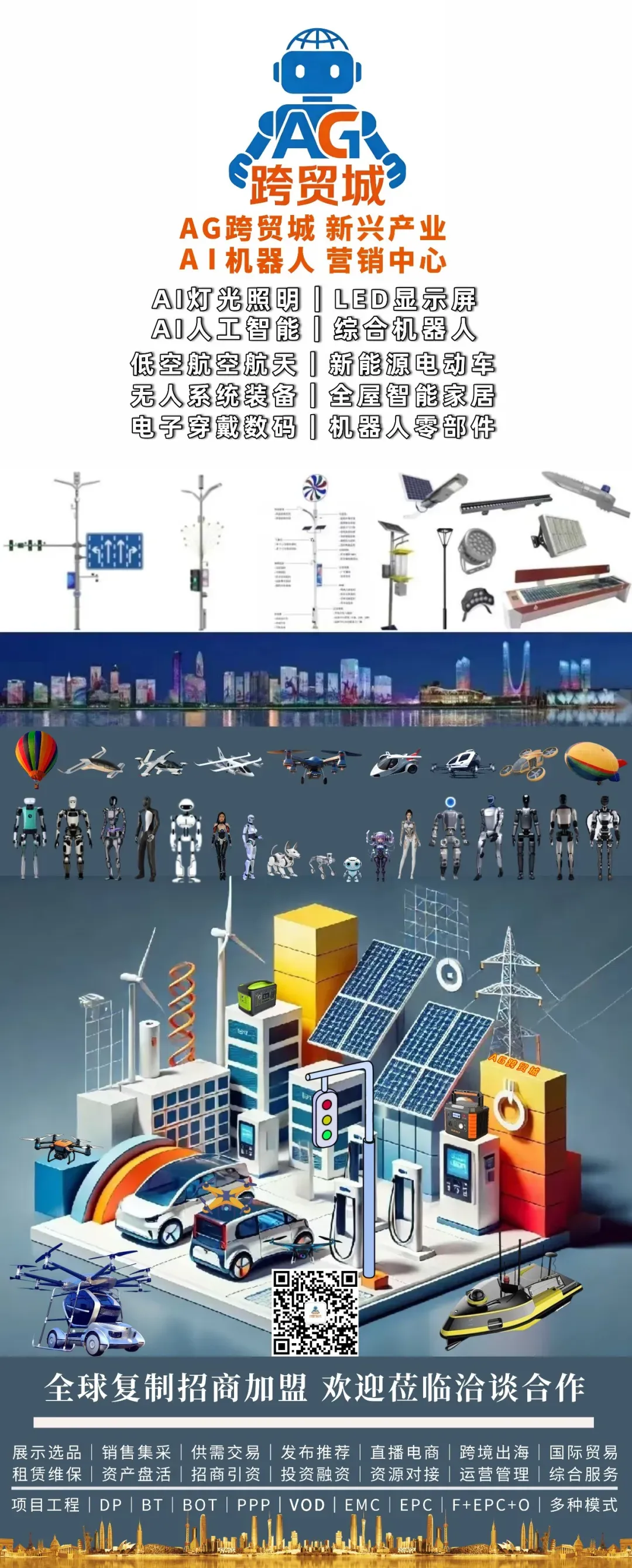 AG跨贸城业态融合:AI机器人生态城,运营中心、展销中心、创新中心、展示厅、科技馆、产业园、自贸港、人机署、小镇、基地、街区、剧场、中试区、训练营、研究院、商学院、梦工场、孵化器、加速器、写字楼、办事处、培育中心、租赁中心、体验中心、海归中心、共创空间、共享办公、一人办公、旗舰店、品牌店、专卖店、综合店、集合店、维保店、共享店、社区店、形象店、会客厅、超市、4S店、5S店、6S店、7S店、8S店、9S店、10S店、9SAI智汇馆、AI机器人千城万店、AI机器人项目工程定制中心;