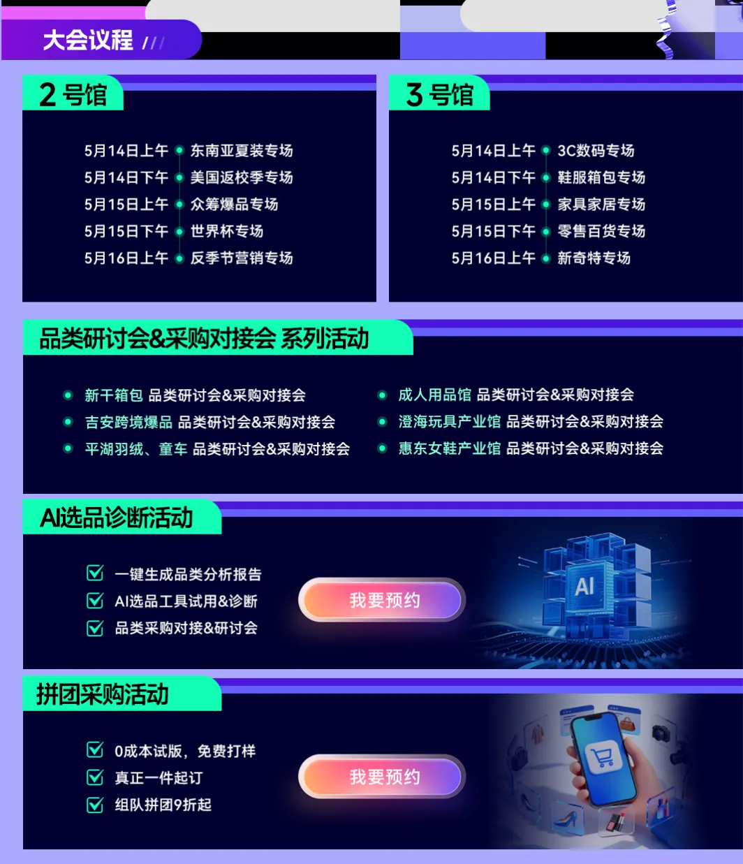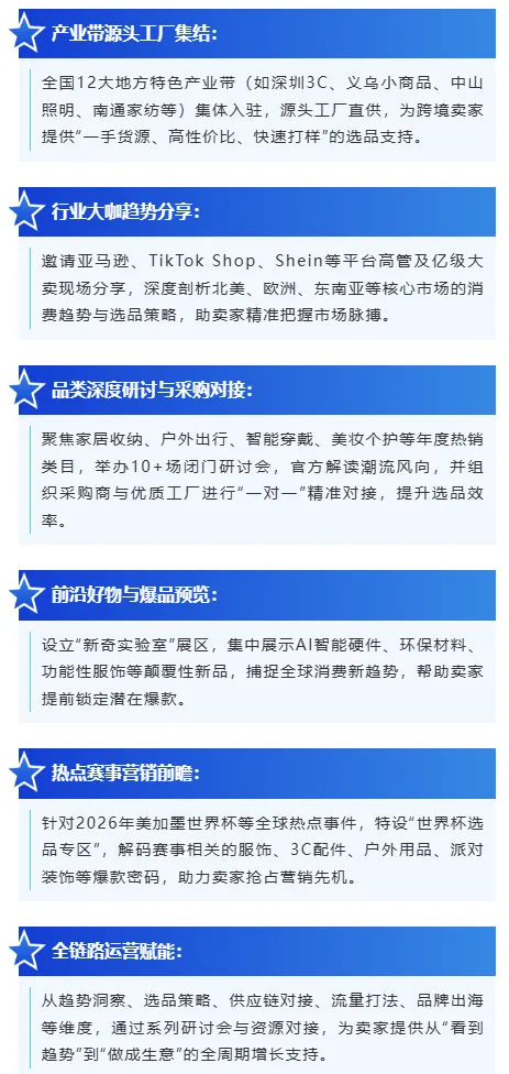 现场规划12+产业馆,汇聚1000+源头工厂与品牌展商,覆盖3C电子、智能家电、家居收纳、宠物母婴、美妆个护等30+热门品类。同期举办多场平台资源对接与选品私享会,助力跨境卖家一站式直连供应链,挖掘2026出海新趋势。
