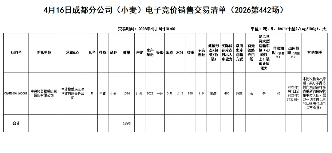 受中国储备粮管理集团有限公司成都分公司委托,重庆市粮油批发市场有限责任公司(即国家粮食重庆交易中心,以下简称“批发市场公司”)定于2026年4月16日10:00举办成都分公司(小麦)电子竞价销售交易会,现将有关事项公告如下: