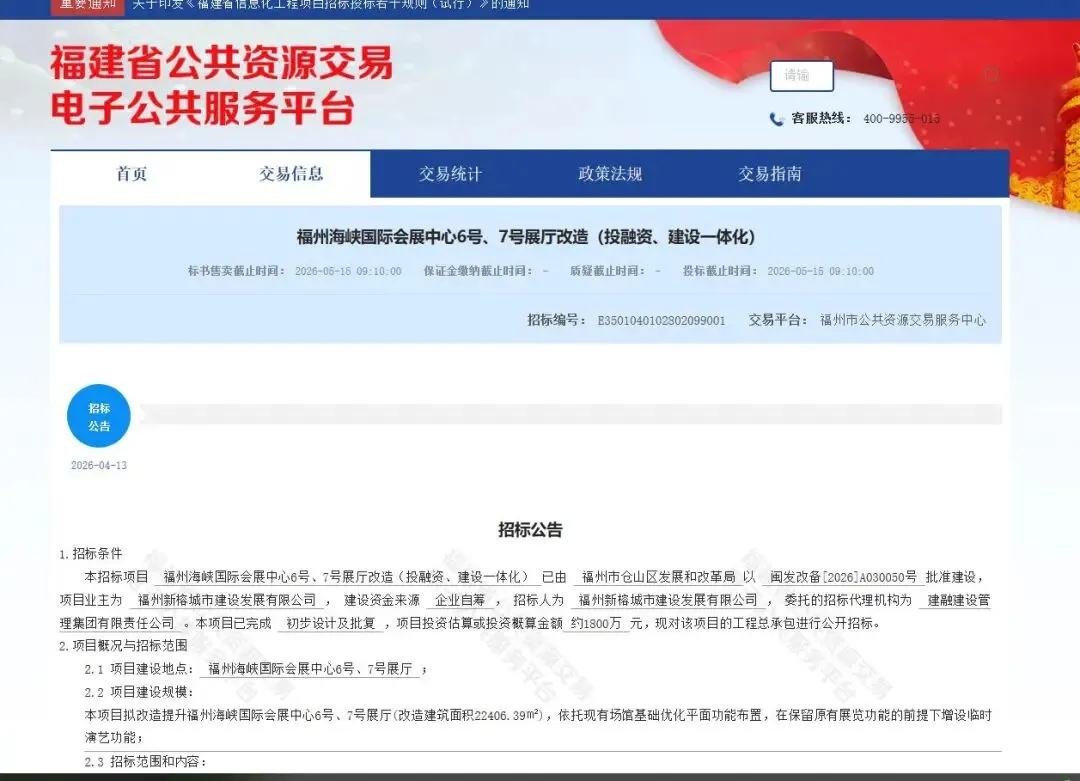 海西房产网(微信公众号:fjhxfcw)消息:2026年4月13日,福州市公共资源交易服务中心发布“福州海峡国际会展中心6号、7号展厅改造(投融资、建设一体化)”招标公告。
