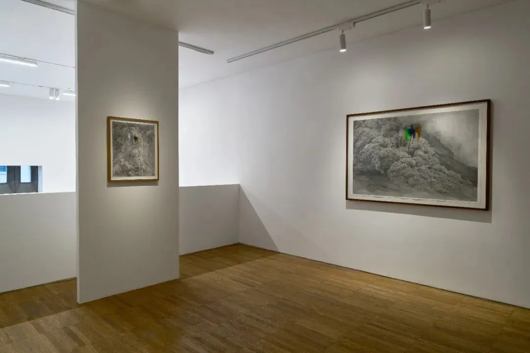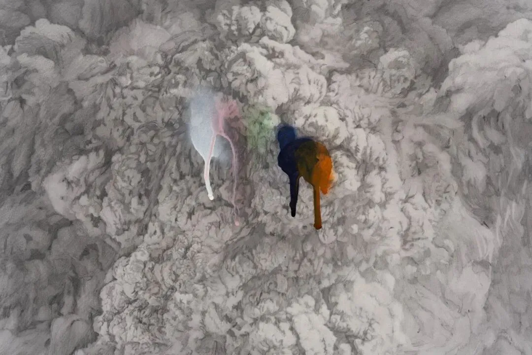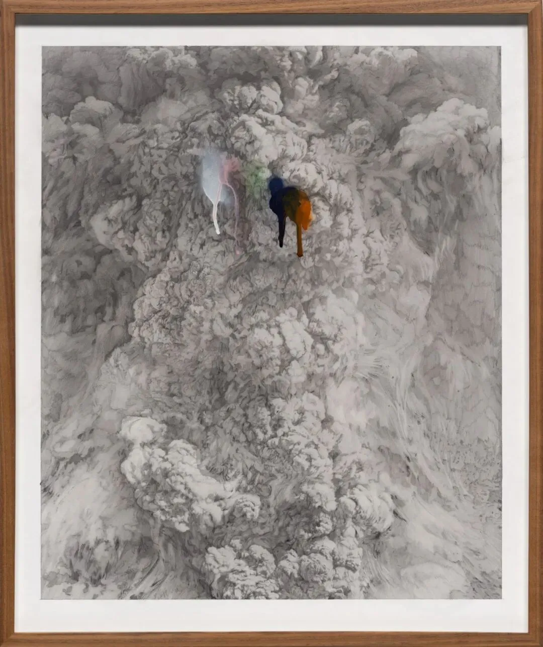 艺术家陈凡秋的作品《彩虹除草剂》系列 (Rainbow Herbicides) 参与了群展中的「毁灭之火」(Fire and Ruin)章节。在陈凡秋的创作中,她以抽象的方式探索了越战中“彩虹除草剂”(Rainbow Herbicides)对越南环境和人民造成的深远影响。1965年,美国军方在越战中使用了带有标志性彩条的“彩虹除草剂”。这些有毒化学物质从飞机和直升机上喷洒,对茂密的植被造成了严重破坏,对当地居民健康造成了长期影响,包括罕见癌症、先天缺陷、神经系统疾病等。在与该化学药剂同名的绘画系列中,陈凡秋用石墨精心绘制的巨大羽流汇集了火山喷发、人造爆炸和云层照片的细节,并在画面表面涂上随重力向下滴落的彩色喷漆,从而表达出越南战争中的致暗时刻。