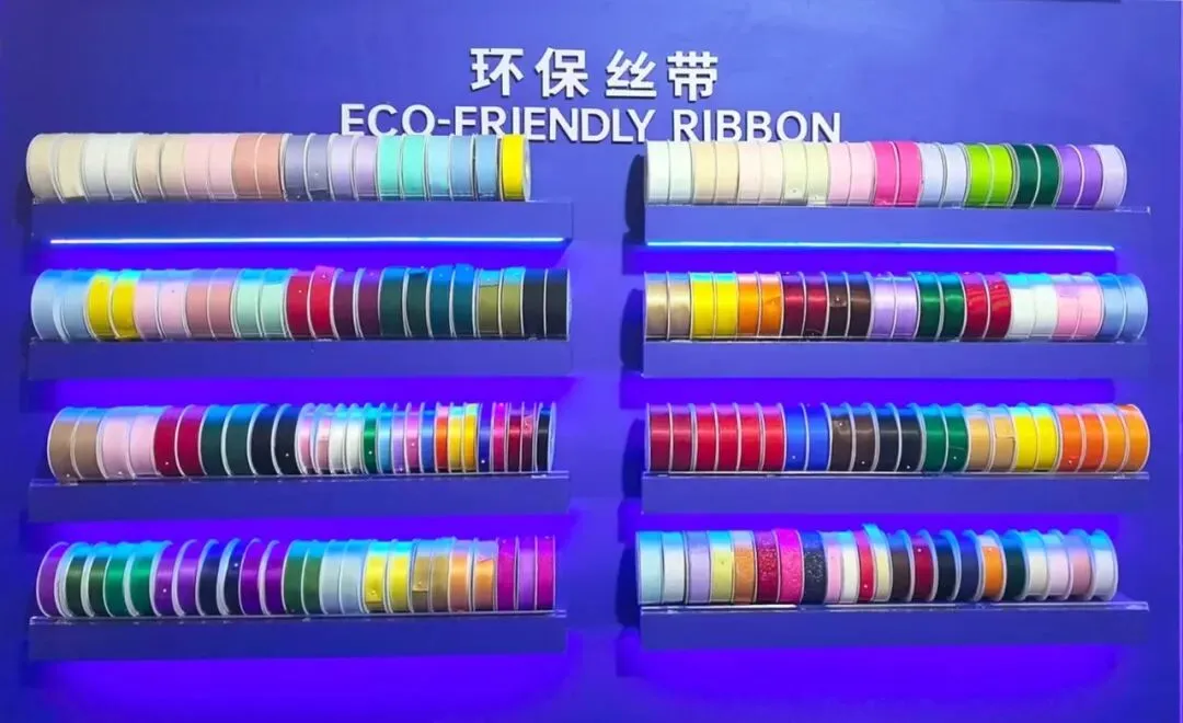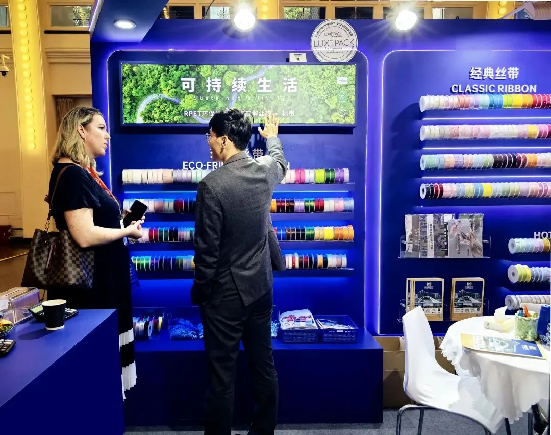 值得一提的是,环保丝带、环保纸织带践行可持续理念,采用棉带、再生涤棉、天丝等天然 /可循环材质,质感细腻、触感温润,完美契合奢侈品牌对绿色责任与高端质感的双重追求,成为展会上的一大亮点。