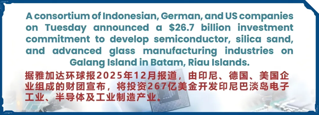 印尼政府将电子产业发展列为国家优先发展产业,对进口组装设备减免50%关税,并设立10亿美元专项基金扶持本土化生产。2026年被正式定为工业加速年,政府计划在金属、机械、交通运输设备和电子领域将印尼打造为生产与技术中心。印尼还发布了2026-2036年半导体产业发展路线图,致力于吸引全球半导体投资。