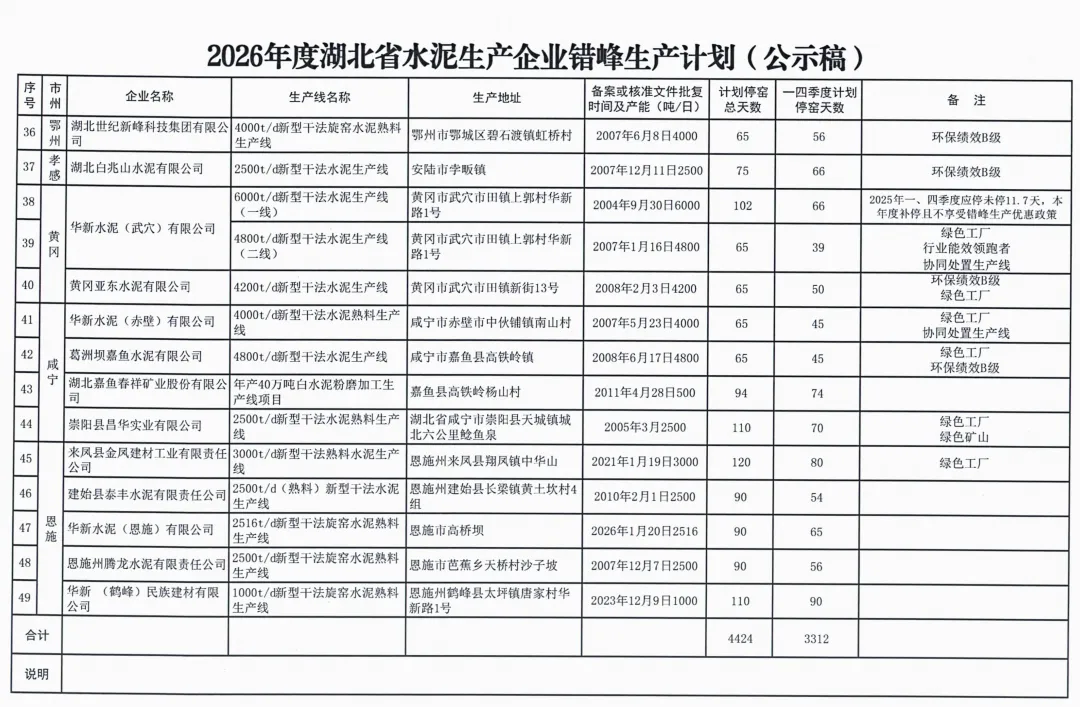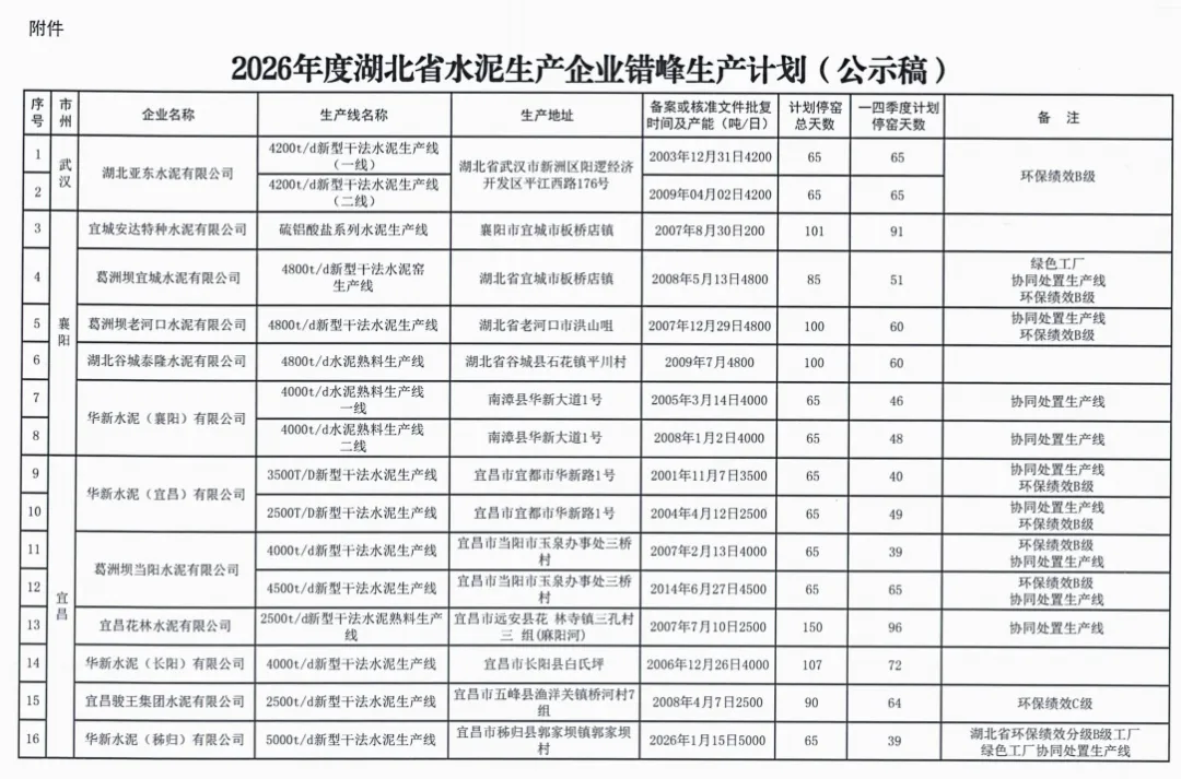 4月10日,湖北省经济和信息化厅发布《2026年度湖北省水泥生产企业错峰生产计划》,全省共计49条水泥熟料及特种水泥生产线纳入年度错峰安排,将通过差异化停窑调控,统筹稳供给、压产能、减排放多重目标。