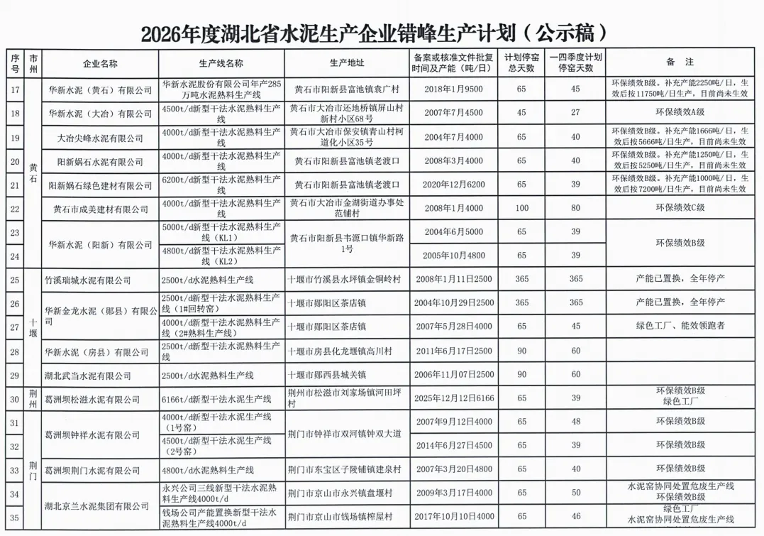 湖北省此次公示的错峰生产计划覆盖武汉、襄阳、宜昌、黄石、十堰、荆州、荆门、鄂州、孝感、黄冈、咸宁、恩施等全省多个市州,涉及亚东水泥、葛洲坝水泥、华新水泥、尖峰水泥、娲石水泥等众多重点水泥企业,覆盖不同规模、不同类型生产线。