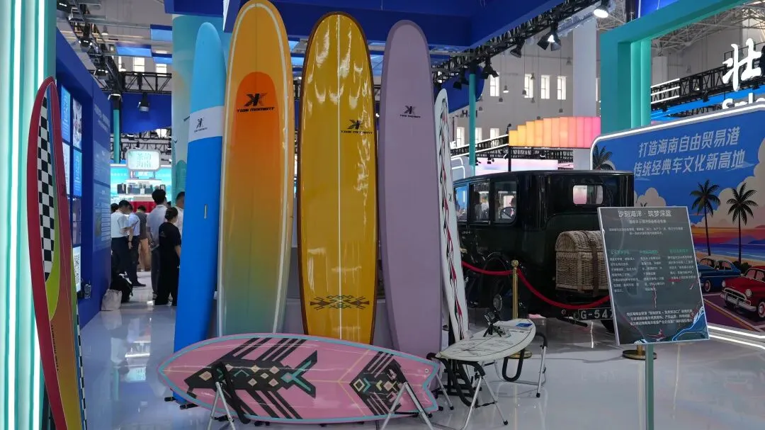 海南馆内,汐刻(海南)海洋装备制造有限公司展示了自主研发的冲浪板、冲浪运动相机、造浪池等产品,集中呈现了万宁在海洋装备制造领域的发展成果。其中,覆盖初学者、进阶浪人及专业竞技选手的全谱系冲浪板,可根据使用者的身形、浪况和风格进行私人定制。凭借自研材料专利技术,这些冲浪板在强度、耐用性、环保性能等方面表现突出。
