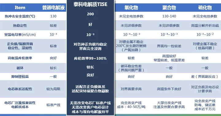 泰科聚能自主研发的高安全电解质(TISE 塑晶固态电解质),通过特殊核心添加剂组合,在(某温度)高温环境下可触发材料分子键(碳氢键、碳氧键等)断裂,在隔膜与正极表面形成耐高温(理论耐受温度达 1000℃)、高导热(导热效率为传统材料的710倍)的保护膜,有效抑制氧气析出与热失控链式反应,从根源上解决电池安全问题。