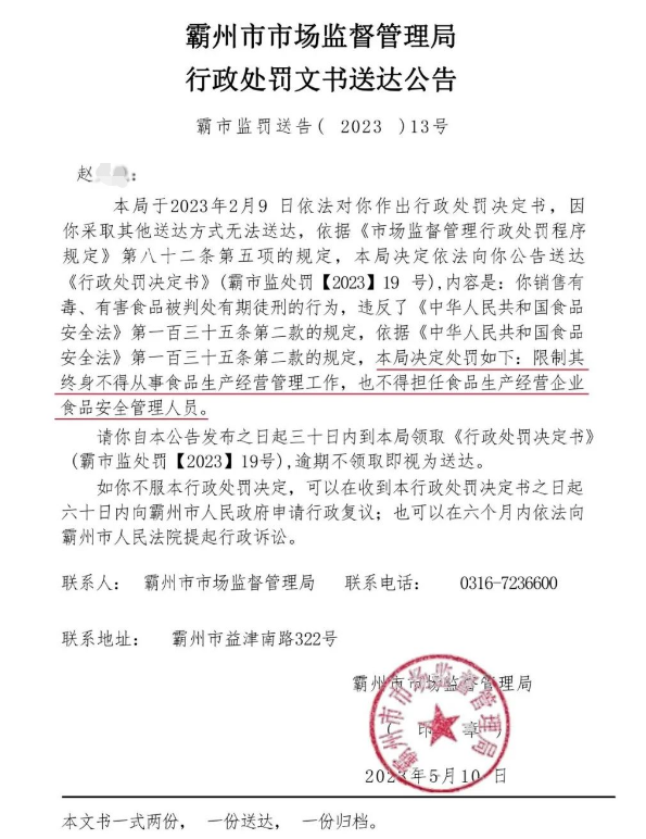 本局于2023年2月9日依法对你作出行政处罚决定书,因你采取其他送达方式无法送达,依据《市场监督管理行政处罚程序规定》第八十二条第五项的规定,本局决定依法向你公告送达《行政处罚决定书》(霸市监处罚[2023] 19号),内容是: 你销售有毒、有害食品被判处有期徒刑的行为,违反了《中华人民共和国食品安全法》第一百三十五条第二款的规定,依据《中华人民共和国食品安全法》第一百三十五条第二款的规定,本局决定处罚如下:限制其终身不得从事食品生产经营管理工作,也不得担任食品生产经营企业食品安全管理人员。请你自本公告发布之日起三十日内到本局领取《行政处罚决定书》(霸市监处罚[2023] 19号),逾期不领取即视为送达。如你不服本行政处罚决定,可以在收到本行政处罚决定书之日起六十日内向霸州市人民政府申请行政复议;也可以在六个月内依法向霸州市人民法院提起行政诉讼。联系人:霸州市市场监督管理局