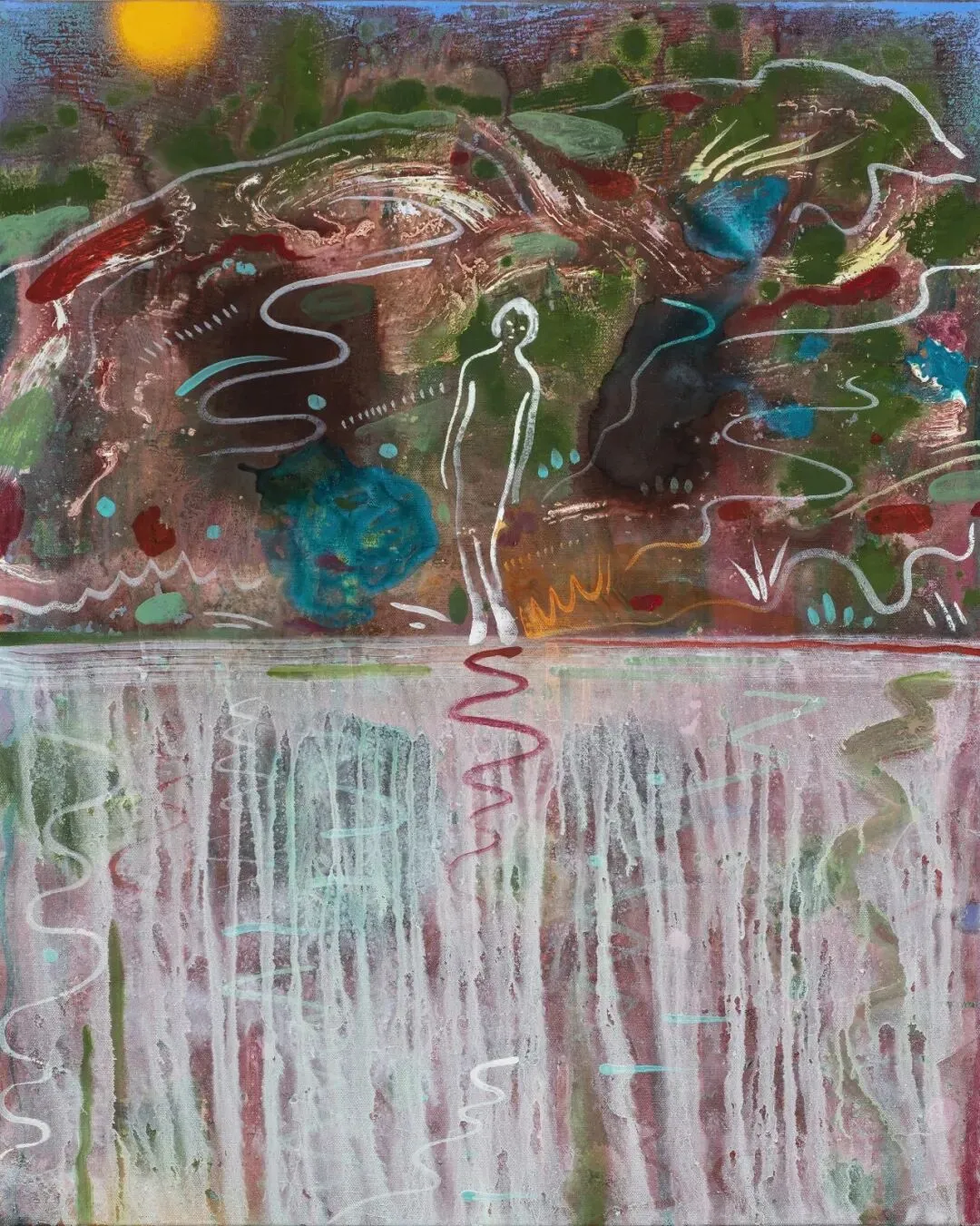 在此,一切皆非预设:没有预备草图,没有固定构图。材料汇聚、交融、碰撞。色渍漫延,滴流淌溢,偶然性占据主导。有些形态消失,有些得以留存。绘画成为一片变形的场域,没有任何事物全然静止。这种流动性的处理方式同样体现在笔触之中。连绵的线条、曲线与运动,让人联想到风吹过水面时泛起的涟漪。海的深处与天际的无垠相互交缠;浪花与云朵仿佛同属一片变幻不居的物质。一切皆在流转。
