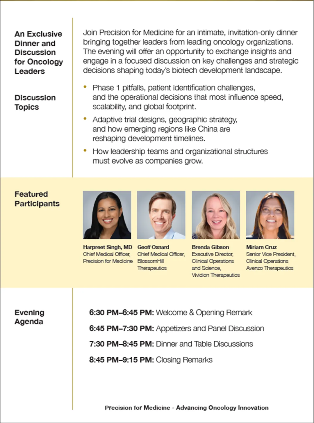 此外,Precision for Medicine(劲准PfM)还将于4月21日晚举办Precision晚宴系列(Precision Dinner Series)活动。本次活动将以晚宴+圆桌讨论的形式,面向临床运营与研发领域的高级管理人员,邀您与前FDA肿瘤审评高管及业内资深同仁,深入研讨肿瘤临床研发新趋势。