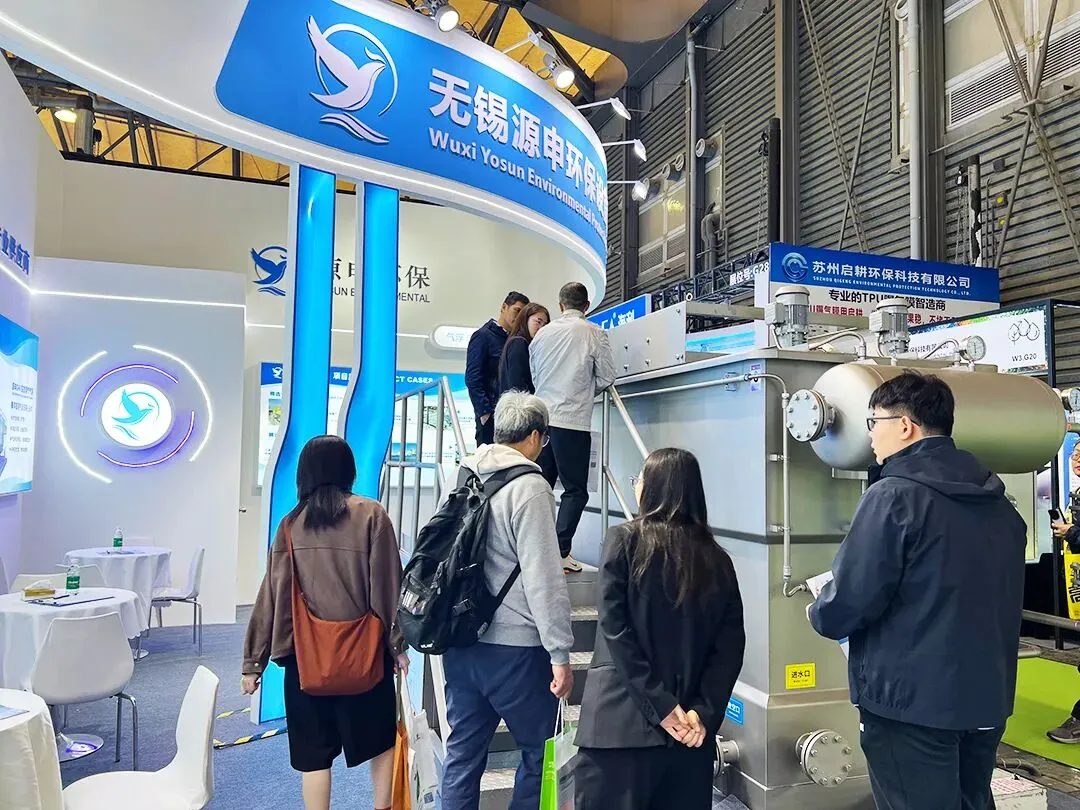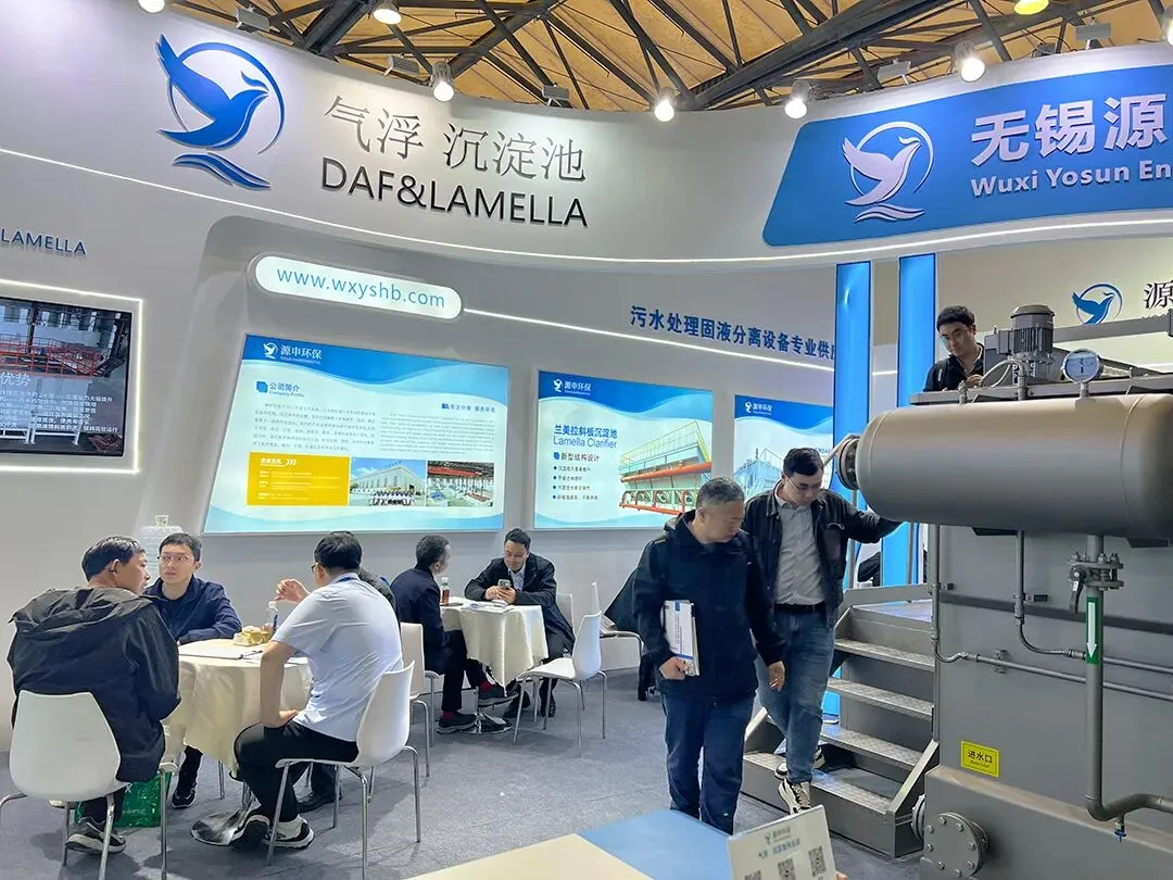 2026年4月14日,第27届上海环博会进入第二天。上海新国际博览中心依旧人声鼎沸,专业观众的热情有增无减。源申环保位于W3 - G21的展位延续了首日的火爆态势,那台现场运行的气浮机实物继续成为全场焦点,吸引了更多带着具体项目需求而来的专业买家与工程公司。