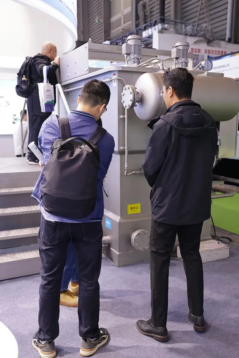 第二天,我们的气浮机实物依然平稳运转,微气泡翻腾、刮渣机构有序工作,直观展示着高效的固液分离过程。不少昨天已经来过展位的客户,今天特意带着同事或技术团队再次到访,只为更深入地了解设备细节。
