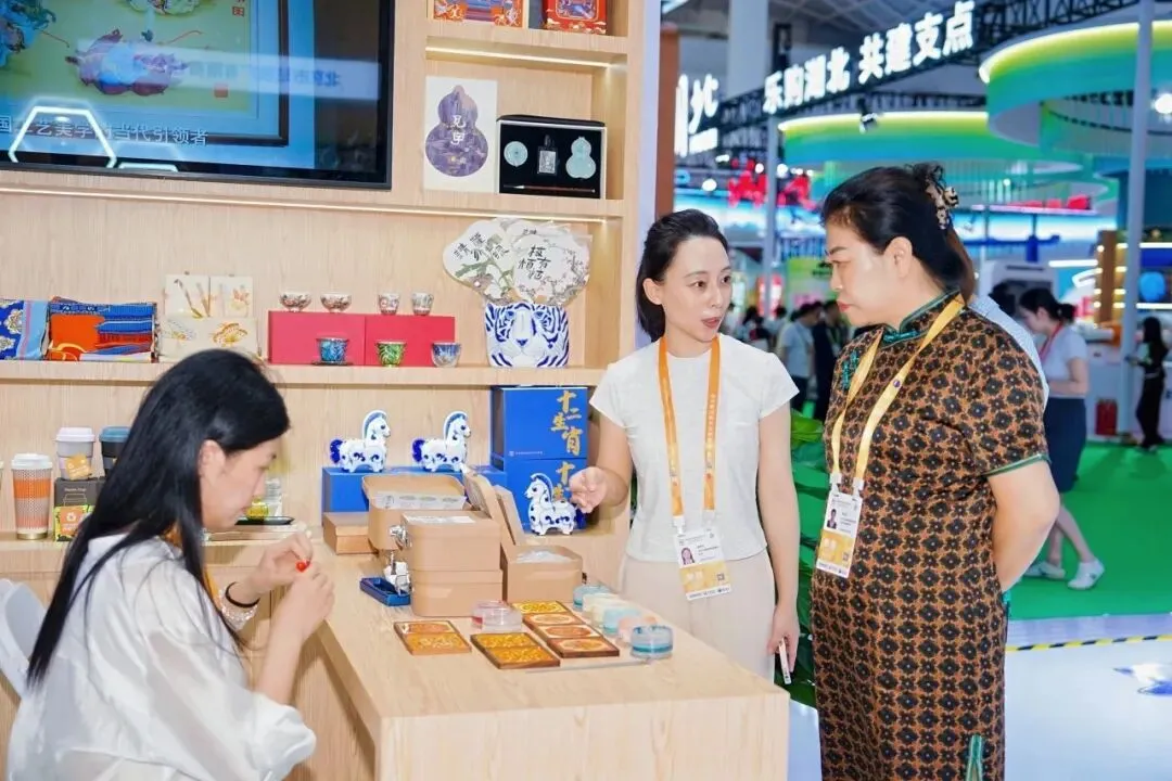 北京工美展位前吸引了不少观众与专业买家的目光,前来洽谈对接的客户络绎不绝,进一步扩大了传统工艺的社会关注度。
