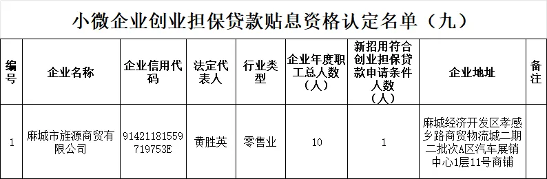 为进一步优化营商环境,持续释放创业带动就业的倍增效应,切实解决小微企业“融资难、融资贵”问题,根据国家统计局关于印发《统计上大中小微型企业划分办法(2017)的通知》(国统字〔2017〕213号)、财政部《普惠金融发展专项资金管理办法》(财金〔2023〕75号)及省财政厅《关于明确创业担保贷款财政贴息有关政策标准的通知》(鄂财金发〔2023〕34号),现对2026年度第九批小微企业创业担保贷款贴息资格认定已审核通过的1家企业名单进行公示。如发现有企业不符合相关政策规定,请向麻城市劳动就业服务中心反映,经认定公示不存在异议的小微企业名单将提交至下一步流程审核。