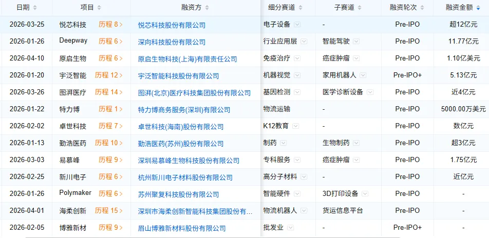 2026年以来,市场公开披露的Pre-IPO项目已达13个,多数同步公布了融资金额。其中融资规模最高的项目来自电子设备赛道,金额超12亿元。
