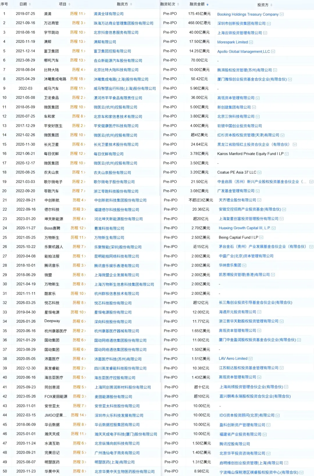 企业预警通依据公开披露信息统计,过往明确融资额的Pre-IPO项目中,融资金额超10亿元的有47个,头部融资方均为市场知名企业,比如滴滴、万达和字节跳动等。2026年融资额最高的悦芯科技,位列历年Pre-IPO 融资榜第32位,公开披露的 PE/VC 融资累计已达8轮。