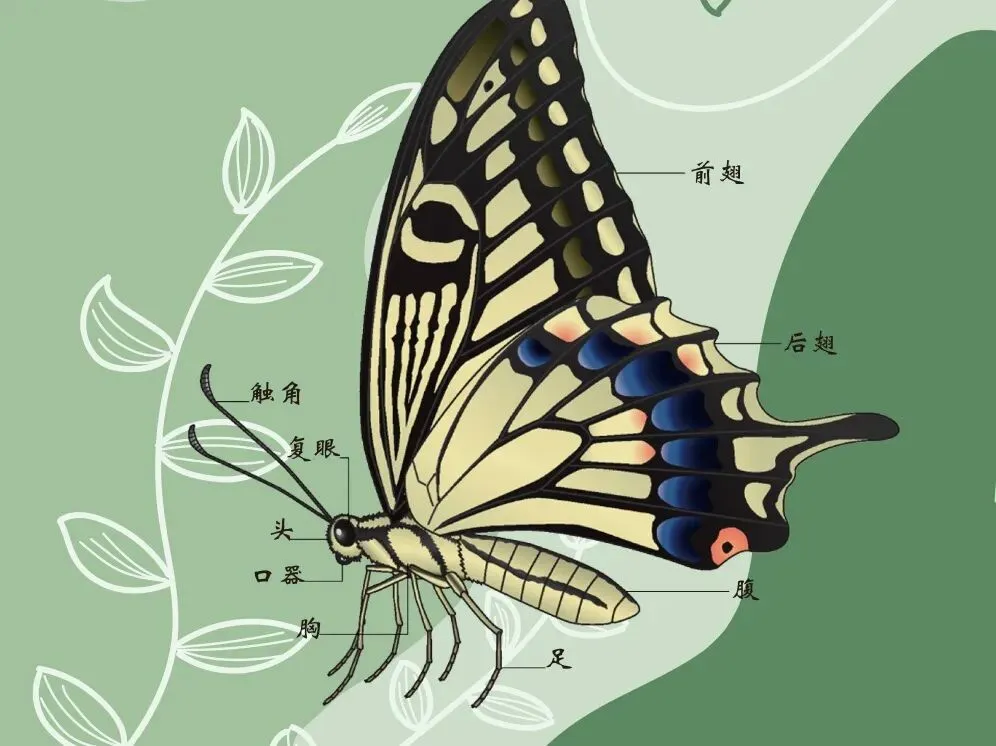昆虫的身体分为 头、胸、腹三段。头部长着单眼和复眼、触角和口器。胸部长有三对足,多数还有两对翅。腹部包括消化系统和生殖系统。骨骼长在身体的外部,这层外骨骼在柔软的内部器官周围形成了一层坚硬的、起保护作用的体壁。生长发育经历变态发育过程。