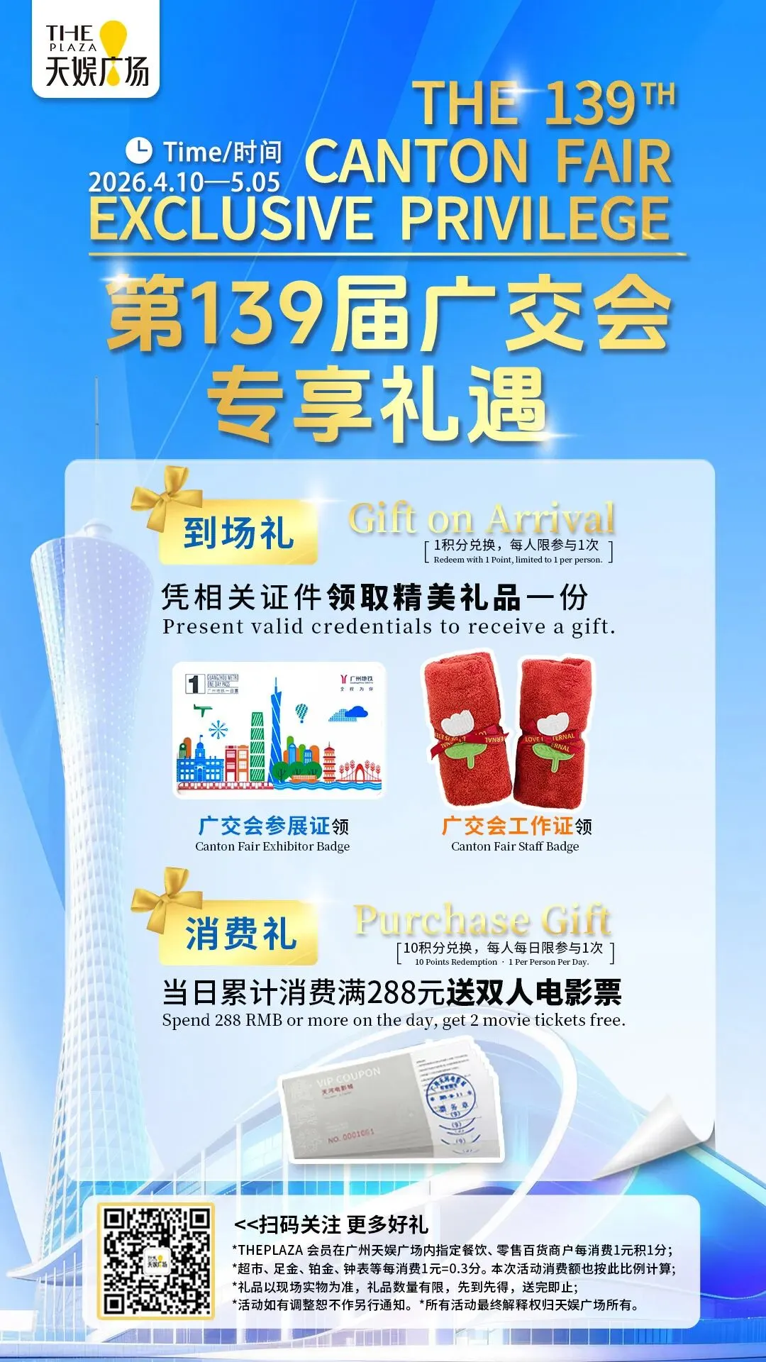 凭广交会相关证件,当日累计消费满288元,10积分即可兑换双人电影票,休闲观影超惬意!