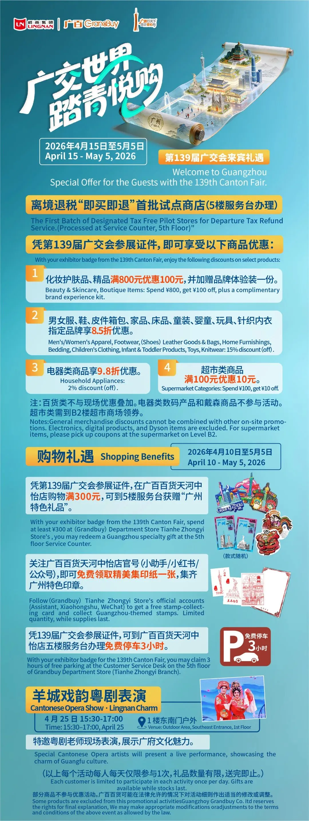 ✅凭广交会证件享优惠:化妆护肤品/精品满800减100送体验装;男女服/鞋/包/家品/床品/童装/玩具等指定品牌8.5折;电器9.8折;超市满100减10