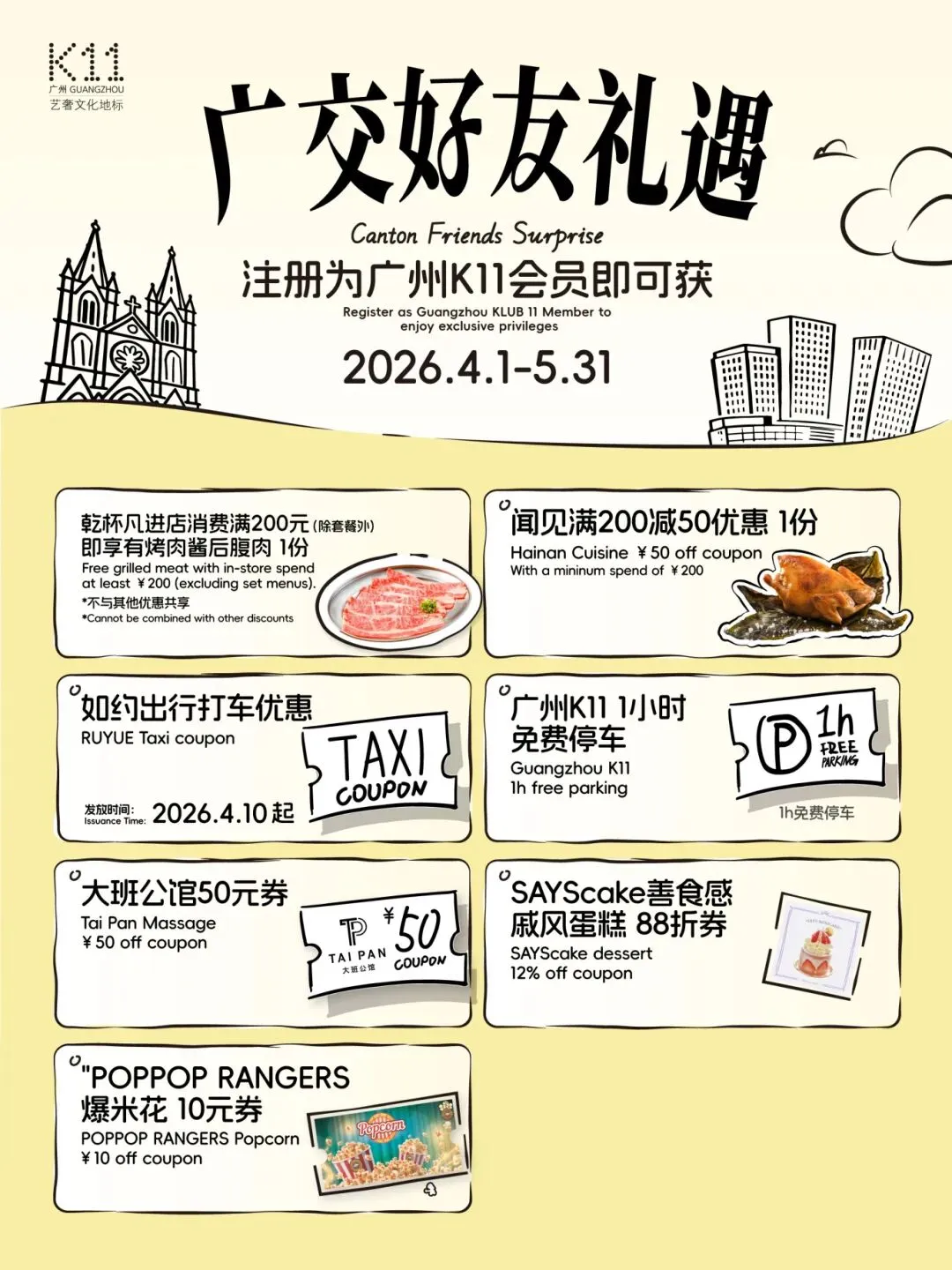 注册广州K11会员,凭广交会凭证/交通出行凭证/酒店住房凭证/演出展览票,即可解锁以下惊喜:乾杯消费满赠、闻见满减优惠、SAYScake蛋糕88折、POPPOP RANGERS爆米花10元券、大班公馆优惠券、如约出行打车券、1小时免费停车