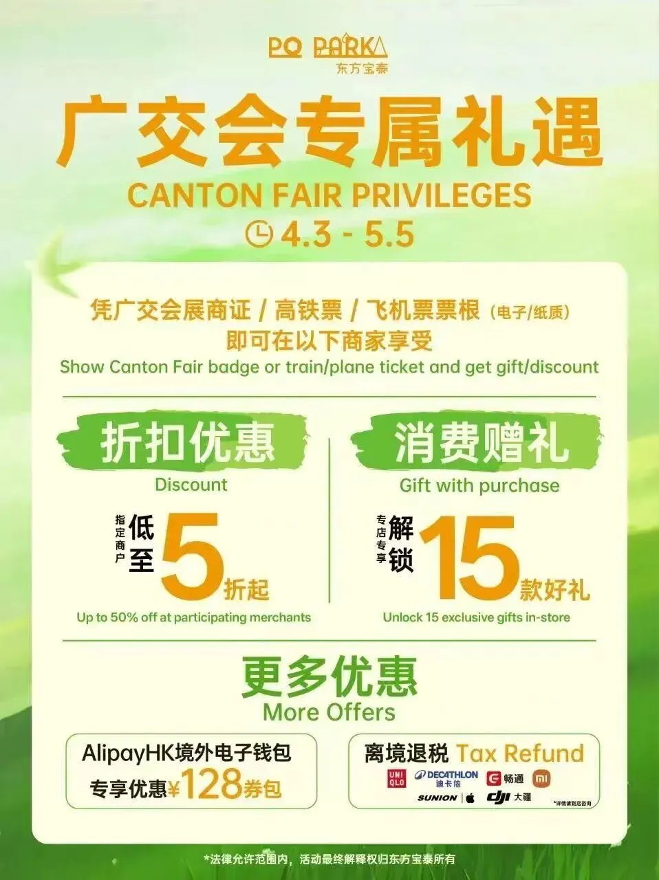 凭广交会展商证/高铁票/飞机票票根(电子/纸质均可),享指定零售、餐饮商家最高5折福利,还有消费赠礼活动,AlipayHK新客专享,128元券包随心用等,高性价比逛吃首选!